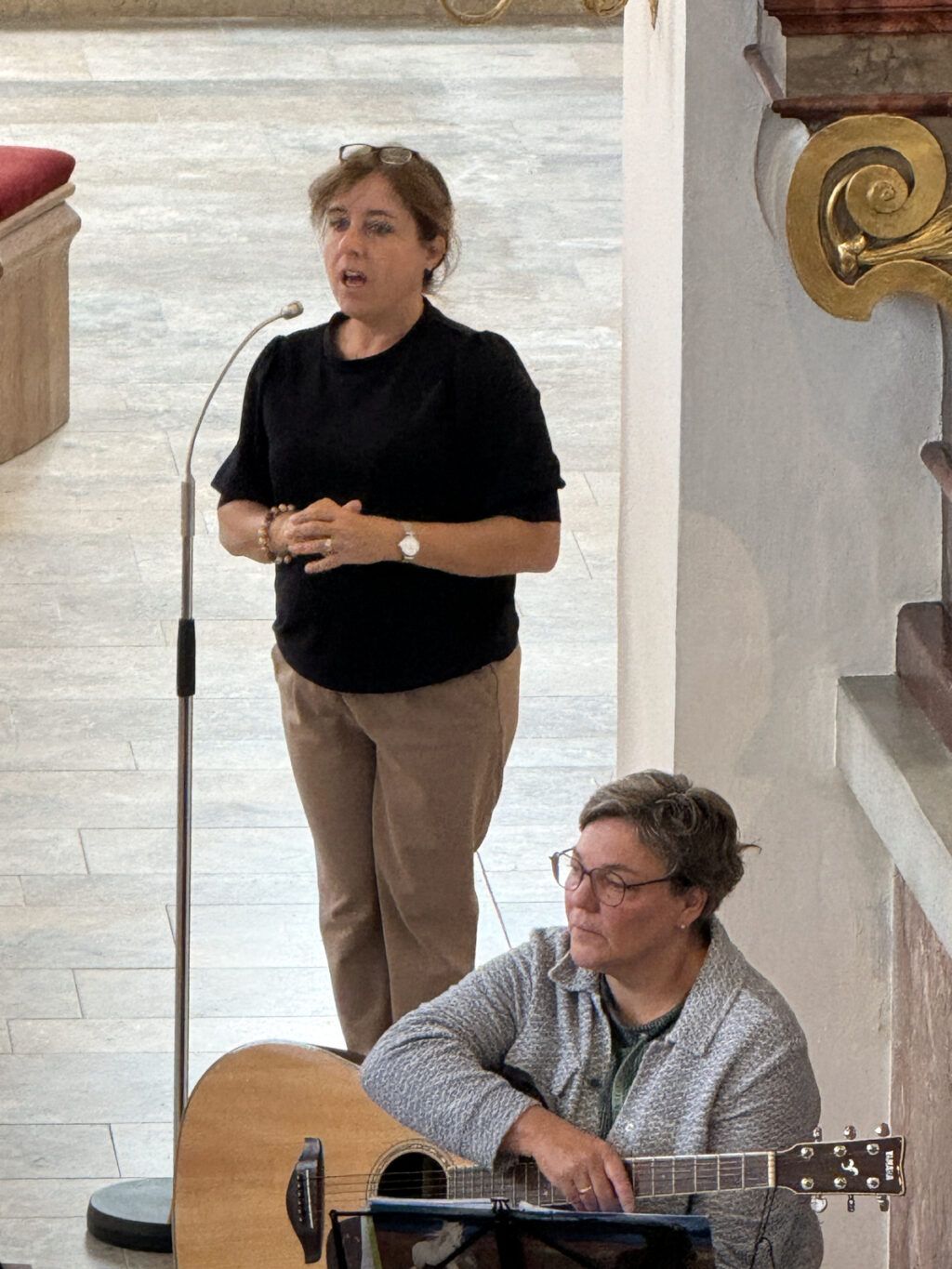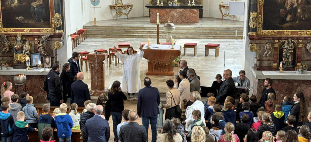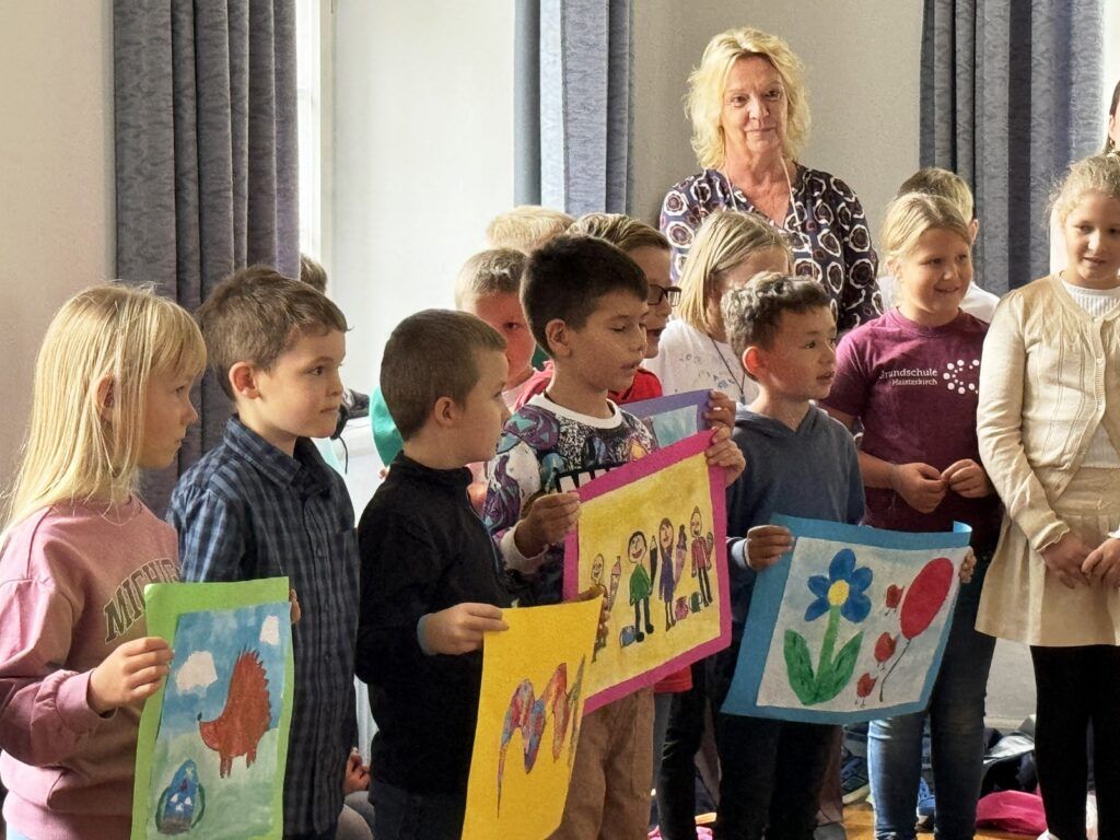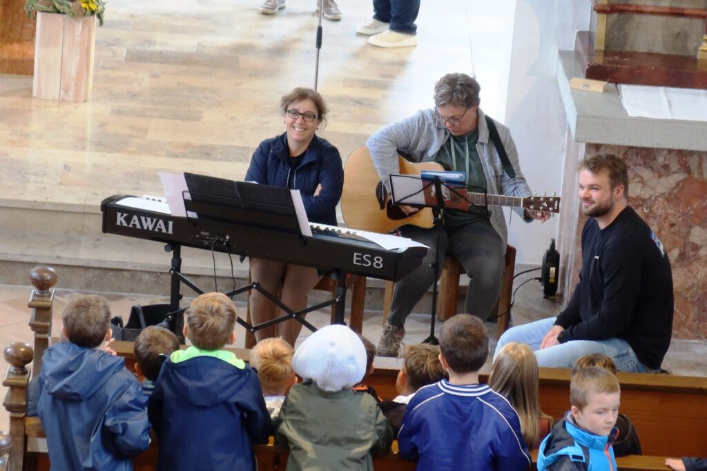 Mit gefälligen Liedern des Schulchors, harmonisch begleitet von der Schulleiterin Angelika Zimmermann am Klavier, wurde die Feier umrahmt. Die Zweitklässler waren voller Eifer dabei, den Neuen die Schule schmackhaft zu machen, ob mit Sprechvortrag zu den mitgebrachten Buchstaben oder mit bewegungsintensiven Tänzen und Spielrunden auch der Dritt- und Viertklässler. Die ganze Schulgemeinschaft nahm an dem überaus herzlichen Empfang teil. Großer, dankbarer Beifall wurde oft gespendet. Schulleiterin Angelika Zimmermann bedankte sich für die Gottesdienstgestaltung und die netten Programmbeiträge.
