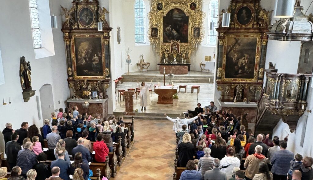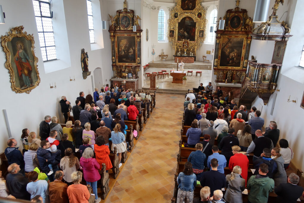 So viele Schulanfänger (Bild) gab es hier schon lange nicht mehr. Das war auch der Grund, weshalb die Schulleitung den Start ins Schulleben in die naheliegende Haisterkircher Pfarrkirche verlegt hatte. Denn in all den früheren Jahren war der Pfarrgemeindesaal unterhalb des Schultrakts immer proppenvoll durch viele Angehörige (Eltern, Großeltern, Paten, Geschwister). Der erste Schultag mit Gottesdienst, Begrüßungsaktionen und Vorstellung des Lehrerinnenteams konnte so dankenswerterweise in den kirchlichen Räumen stattfinden. Das Gotteshaus war voll besetzt wie bei festlichen Gottesdiensten.