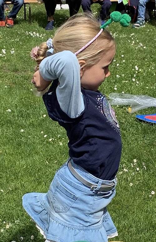Es folgte das Lied „Gottes Liebe ist so wunderbar“.  Bucher forderte zum Dank auf für das Spielen, Lachen und Leben heute. Dazu wieder gut passend sangen alle mit viel Bewegung, angeleitet von Massier und Team, „Du bist unser Gott, Daumen hoch, Du hast uns so lieb“. Auch das Vaterunser wurde mit Hand- und Armbewegungen gesprochen. Es folgte der priesterliche Segen und ein weiteres von den Erzieherinnen einstudiertes Lied: „Der Vater im Himmel segne dich und passe auf dich auf, er gebe dir, was nötig ist …“