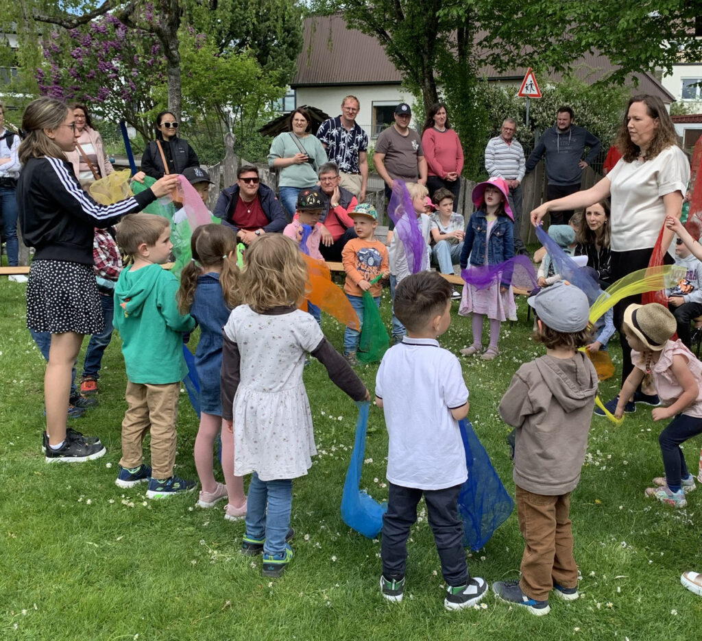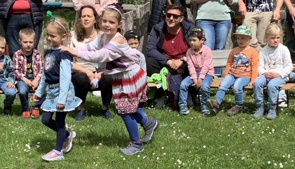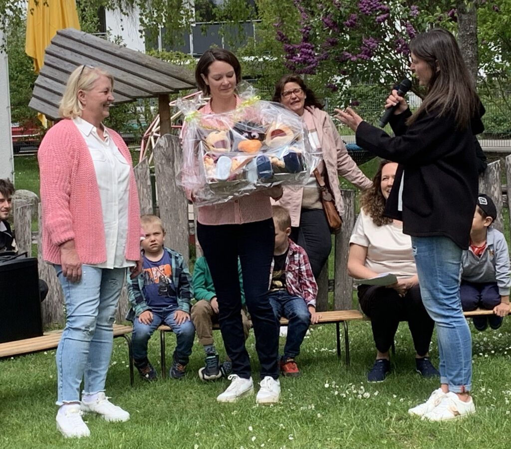 Die dritte Aufführung war der Tanz „Schmetterling, du kleines Ding, such dir eine Tänzerin oder einen Tänzer …“, wobei immer neue Kinder aus dem Kreis dazukommen mussten und mittanzen durften, die Buben etwas schüchterner als die Mädchen! Anschließend überreichten zwei Vertreterinnen des Elternbeirats mit großem Dank ein Geschenk an das Team, drei flauschige Plüschfigürchen, wohl je eines für die drei Gruppen.