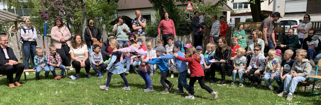 Bad Waldsee – Bei strahlendem Sonnenschein durfte am vergangenen Sonntag (5.5.) der Kindergarten St. Martin in der Molitorstraße sein Jubiläum feiern. Bunte Luftballons und farbige Lettern vermittelten bereits außen, dass es da etwas zu feiern gab. Und man konnte sehen, wie zahlreich Eltern und Großeltern mit ihren Kindern und Enkeln, Kuchenspenden tragend, sich Richtung Festgelände aufmachten. Drinnen war auch alles fürs Fest vorbereitet. Eine Videoschleife schilderte wichtige Stationen der fünfzigjährigen Geschichte. Im großzügigen Außenbereich war ein großer kindgerechter Kreis aufgebaut, in dem die offizielle Feier stattfinden sollte. Und direkt an der Rückseite des Gebäudes gab es reichlich Brauereigarnituren für den späteren „gemütlichen Teil“ der Feierlichkeiten.
