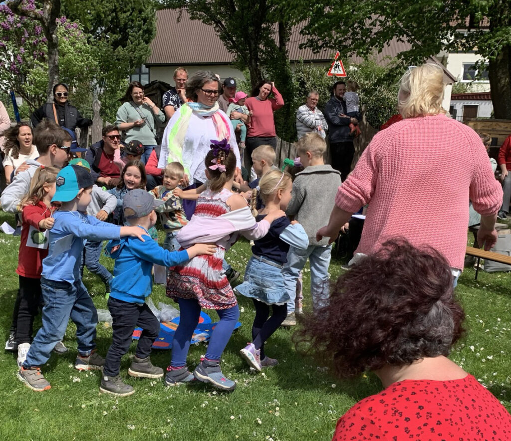 Ursula Massier, seit 1989 Leiterin des von der Kirchengemeinde St. Peter getragenen Kindergartens, bat Kinder und Erwachsene nach draußen zum großen Kreis. Natürlich waren die Kinder der drei Gruppen („Sonnengruppe“, „Wichtelburg“ und „Regenbogengruppe“)  recht aufgeregt vor ihren sicher in vielen Proben einstudierten Aufführungen. Die Leiterin begrüßte nun ganz offiziell die vielen Besucherinnen und Besucher im großen Kreis der Kinder und Erwachsenen.