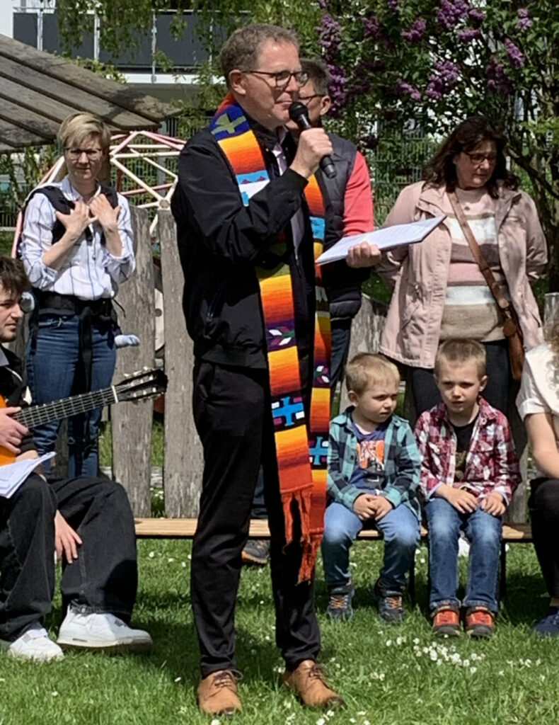 Pfarrer Bucher (Bild) beglückwünschte das Team zum runden Jubiläum und dankte für das Wirken Aller auch im Sinn der Kirchengemeinde, die durch Maria Hirthe vertreten war. Bucher überlegte, wieviele Kinder die Einrichtung in den vergangenen fünfzig Jahren zur Schulreife geführt habe und meinte, es seien wohl mehr als eintausend gewesen. Er lud dann zu einem „kleinen Gottesdienst“. Der begann mit dem Lied „Wir feiern heut ein Fest“, das vor allem die Kinder laut mitsangen. Begleitet wurden sie von zwei jungen Gitarristen, Katja und Simon. Bucher zitierte aus dem Matthäus-Evangelium „Ich bin bei Euch alle Tage bis ans Ende der Welt“. So dürfen wir immer leben und lachen und Team und Eltern seien sich dessen bewusst. Jesus sei ganz sicher auch heute mit uns.