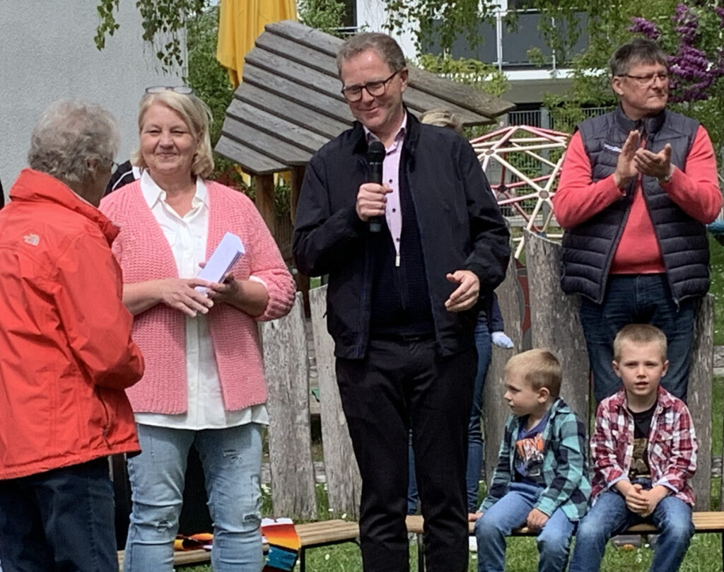 Die Leiterin dankte herzlich für die stetige bauliche Weiterentwicklung durch die Trägerin, die katholische Kirchengemeinde, beispielsweise für energetische Sanierung, Garten und Küche. Natürlich war die Trägerin würdig vertreten durch Pfarrer Thomas Bucher. Massiers Dank galt auch ihrem großen und hochmotivierten Team, den Eltern für ihr Vertrauen und konstruktive Begleitung und Kritik und dem gesamten Elternbeirat.