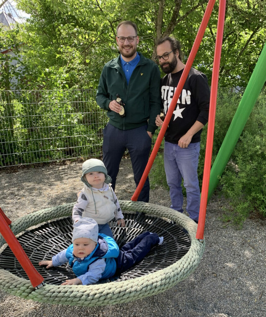 Zwei Väter mit ihren Kleinen in der Nestschaukel (die jüngste Gruppe im St. Martin ist die Altersklasse 1 bis 3).