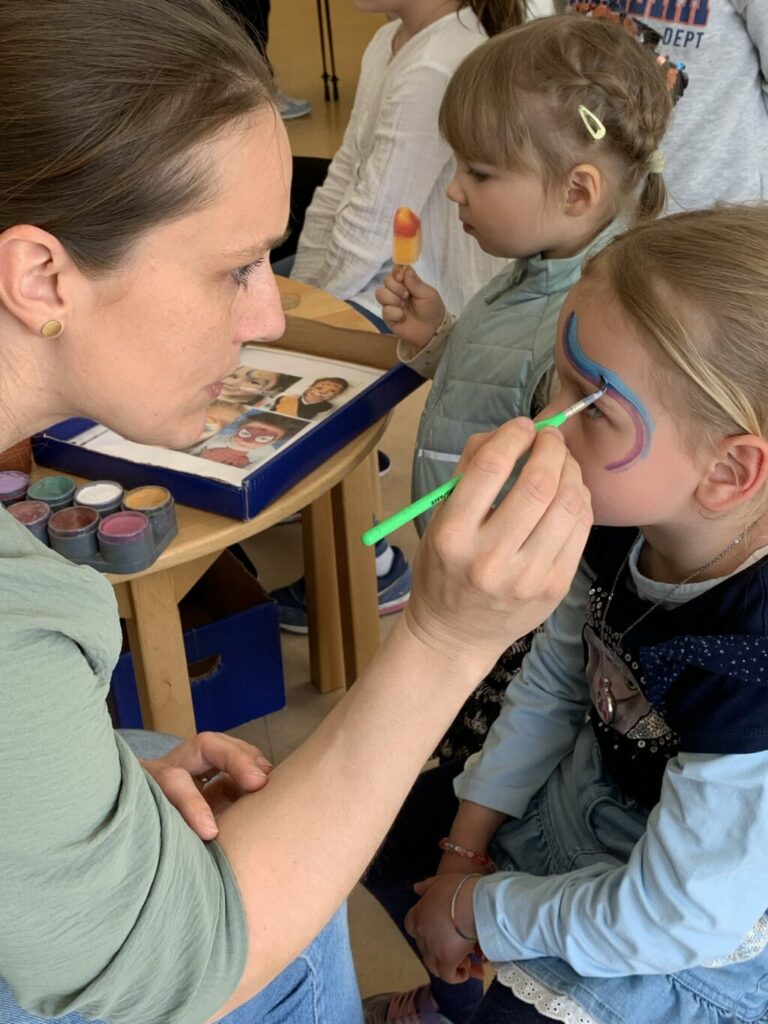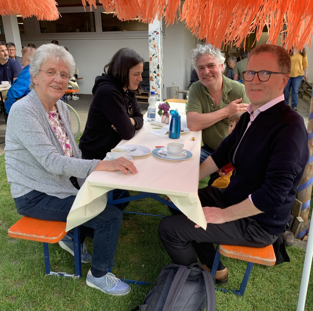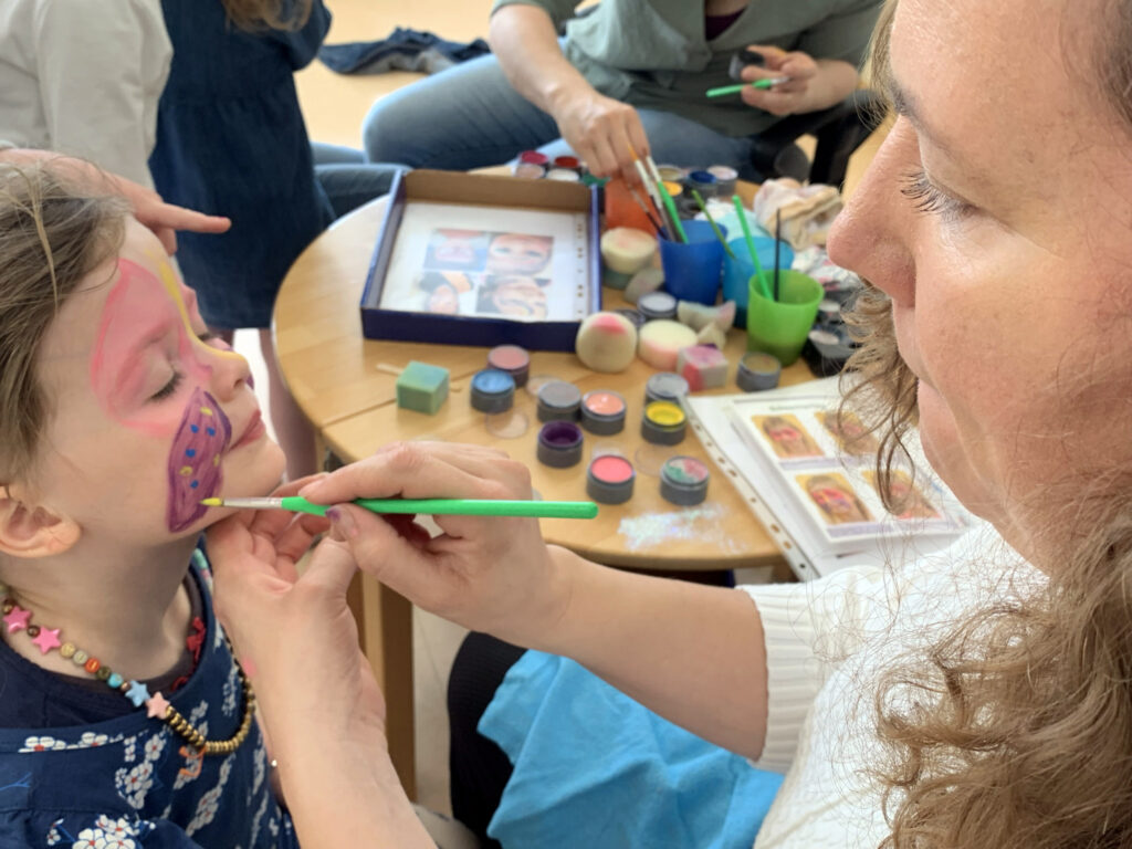 Ursula Massier bat nun „zum gemütlichen Teil“ und kündigte Programmpunkte nur für die Kinder an, darunter eine Überraschung. Man fand sich dazu auf den Brauereigarnituren ein, stürmte das überreiche Kuchenbuffet und holte Kaffee und kühle Getränke. Dabei gab es gute Gespräche und in historischen Fotoalben fand sich so manche Mama oder mancher Papa wieder als Kindergartenkind im St. Martin-Kinde! Für die Kinder gab es Schminken, das drei Erzieherinnen mit großer Sorgfalt und perfekt beherrschten.