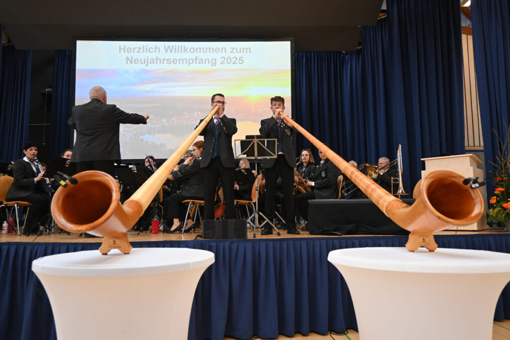 Die Stadtkapelle spielte unter der Leitung von Stadtmusikdirektor Joachim Weiss angenehme Weisen, die Mitarbeiter der Stadt schenkten derweil fleißig Begrüßungsgetränke mit und ohne Alkohol ein. Die Schornsteinfeger boten Glücks-Gebäck in großen Körben dar. Hier und da trafen sich Bekannte. Es wurde geplaudert, man wünschte sich alles Gute fürs neue Jahr.