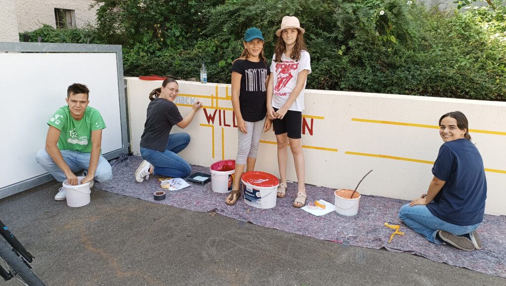 Im Rahmen der 72-Stundenaktion wurde die Bemalung Ende April gestartet. Leider musste sie zweimal wegen Regen und Unwetter abgebrochen werden. Bei herrlichem Sonnenschein konnten die Jugendlichen die Mauer nun kurz vor dem Stadtfest fertigstellen.