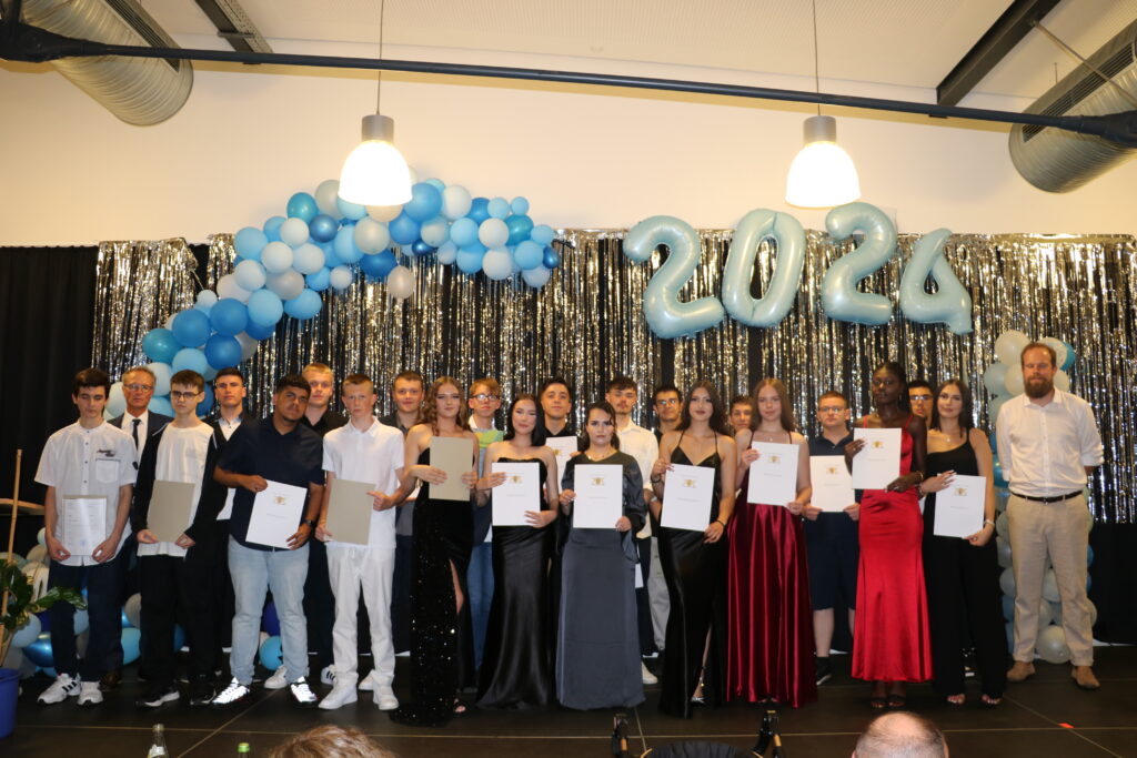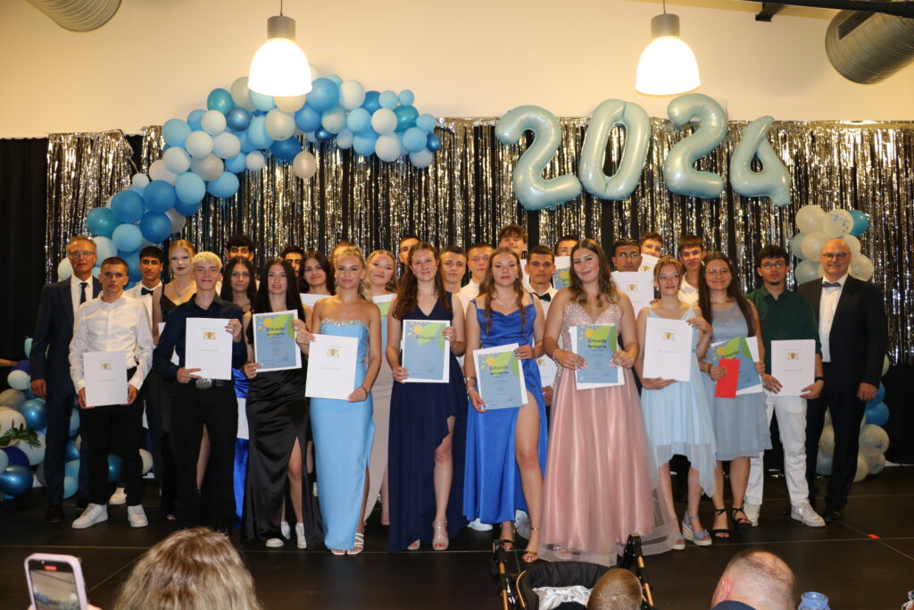 Die inoffizielle Fußball EM Hymne „Major Tom“ wurde eingespielt und der Rektor nahm in seiner Ansprache Bezug auf den Text: Gründlich durchgecheckt stehe einem Start ins weitere Leben nichts mehr im Weg. Auch die beiden Klassenlehrkräfte Jonas Schmid, Klasse 9 und Helmar Fischer, Klasse 10, gaben den Absolventen gute Ratschläge für ihre künftigen Lebensabschnitte mit. Der Schülersprecher Viktor Billing dankte für die Zeit an der Döchtbühlschule und auch Beate Linder aus der Elternschaft sprach den Schülern Anerkennung für das erreichte Ziel aus. Die Klassen verabschiedeten sich mit einem Lied, einem Tanz und eingespielten Fotos aus ihrem Schulleben an der Döchtbühlschule. Durch das Programm führte Karina Kinzel aus Klasse 10.