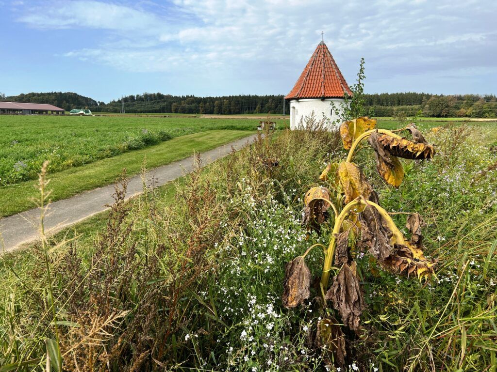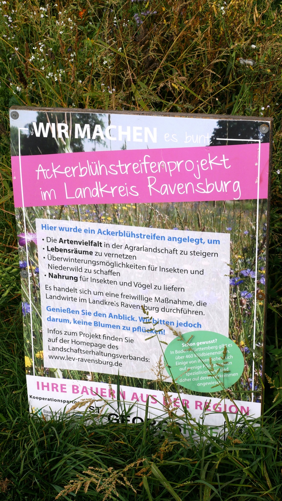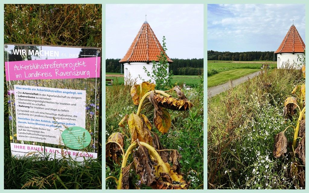 Seit etlichen Jahren schon gehört beispielsweise das Team des St. Georghofs, in Haisterkirch als Zundel-Hof bekannt, zu diesen Projektunterstützern. .An dem viel begangenen Weg vom Sportplatz zur Gott-Vater-Kapelle waren solche Ackerblühstreifen angelegt .worden. Jetzt kann man immer noch einen Reststreifen direkt vor der an markanter Stelle gelegenen Gott-Vater-Kapelle bewundern.