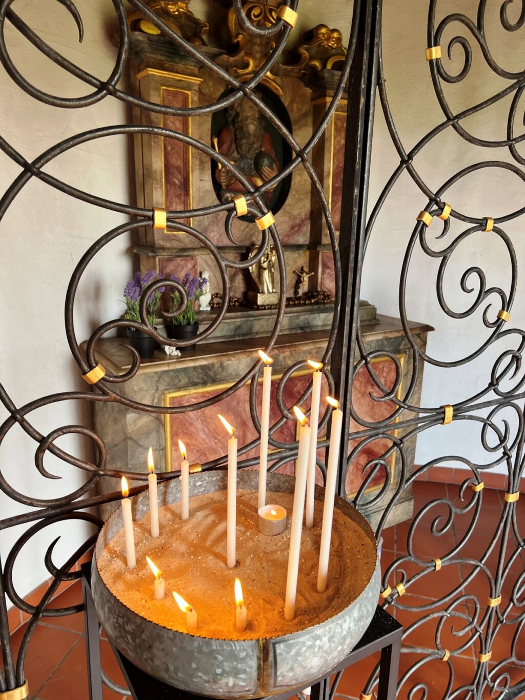 Die Rundkapelle, die im Volksmund auch Spitze Kapelle genannt wird, ist vor allem an den Wochenenden Ziel etlicher Menschen. Erkennbar ist dies an den angezündeten Opferkerzen. Irmgard Nüßlein (Kapelleninneres) und Franz Brauchle (Außenanlage) kümmern sich ehrenamtlich darum, dass diese Kapelle bestens gehegt und gepflegt wird.