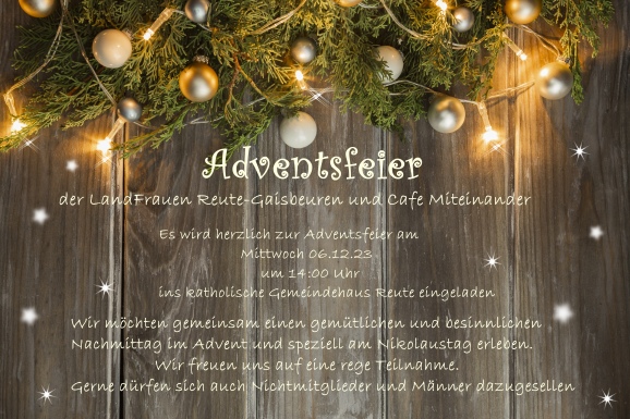 Reute-Gaisbeuren – Es wird herzlich zur Adventsfeier am Mittwoch, 6. Dezember, um 14.00 Uhr