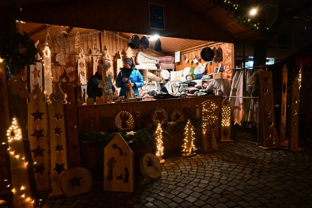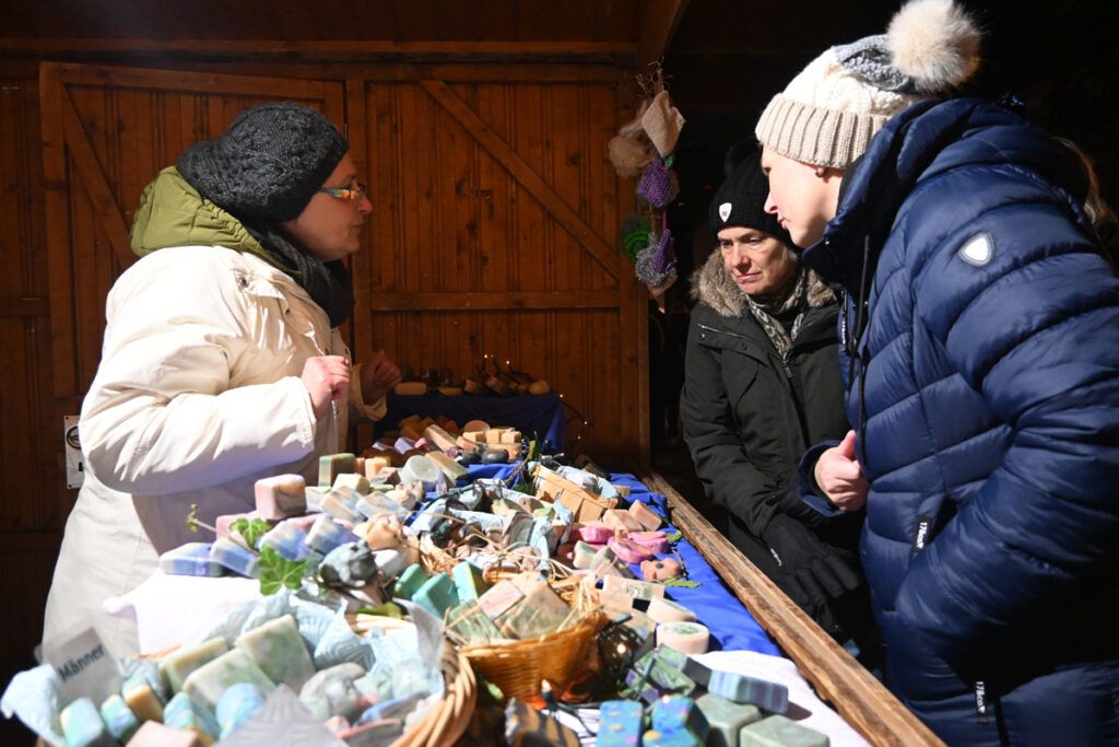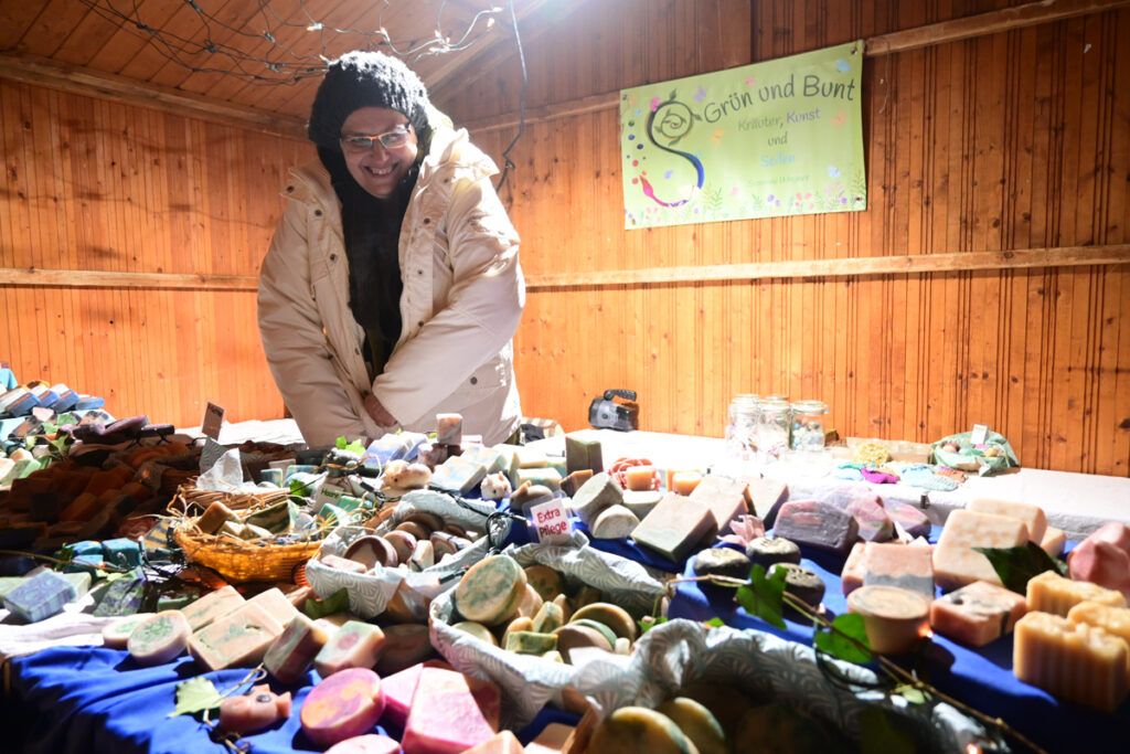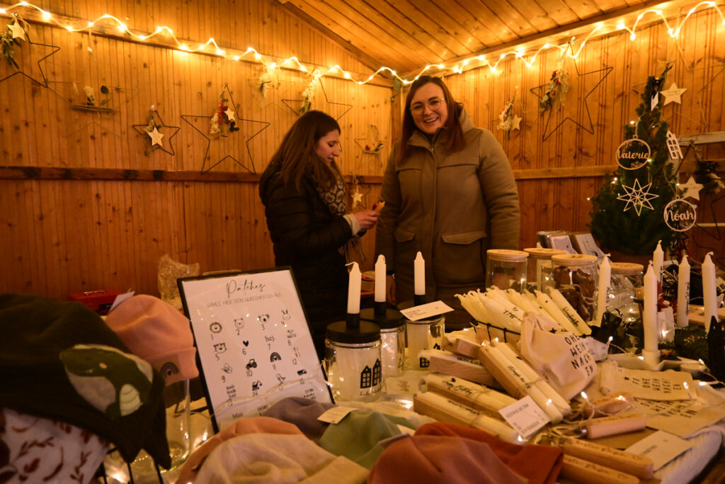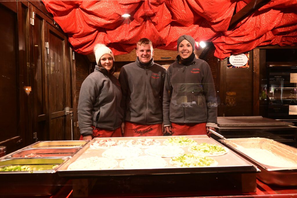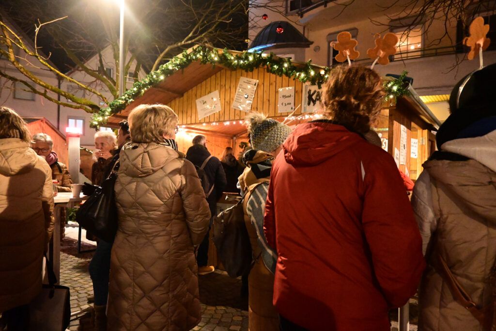 Zum Glühen wurde jede Menge gebracht. An erster Stelle roter und weiße Glühmost. Gut, um die Hände an der Tasse, den Körper und auch die Seele zu wärmen. Bratroste glühten und bräunten knusprige Rote und Weiße. Aus dem glühenden Backofen kamen leckere, knusprige Baumstriezel mit vielen süßen Toppings und aus dem glühenden Pizzaofen gab’s heiße Vinschgerln mit geschmolzenem Käse, Speck und Zwiebeln. Es glühten die elektrischen Lichter an den Verkaufsbuden und es glühten die Backen der Besucher vor Begeisterung. Wie immer bei den Weihnachtsmärkten gab es Schlangen vor den Getränkeständen, während es vor den Verkaufsbuden um 18.00 und 19.00 Uhr noch recht locker zuging. Trotzdem, auf Nachfrage zeigten die Händler sich zufrieden mit der Nachfrage. So fand doch noch das eine oder andere Weihnachtsgeschenk seinen Weg von der Hochstatt auf einen Gabentisch.