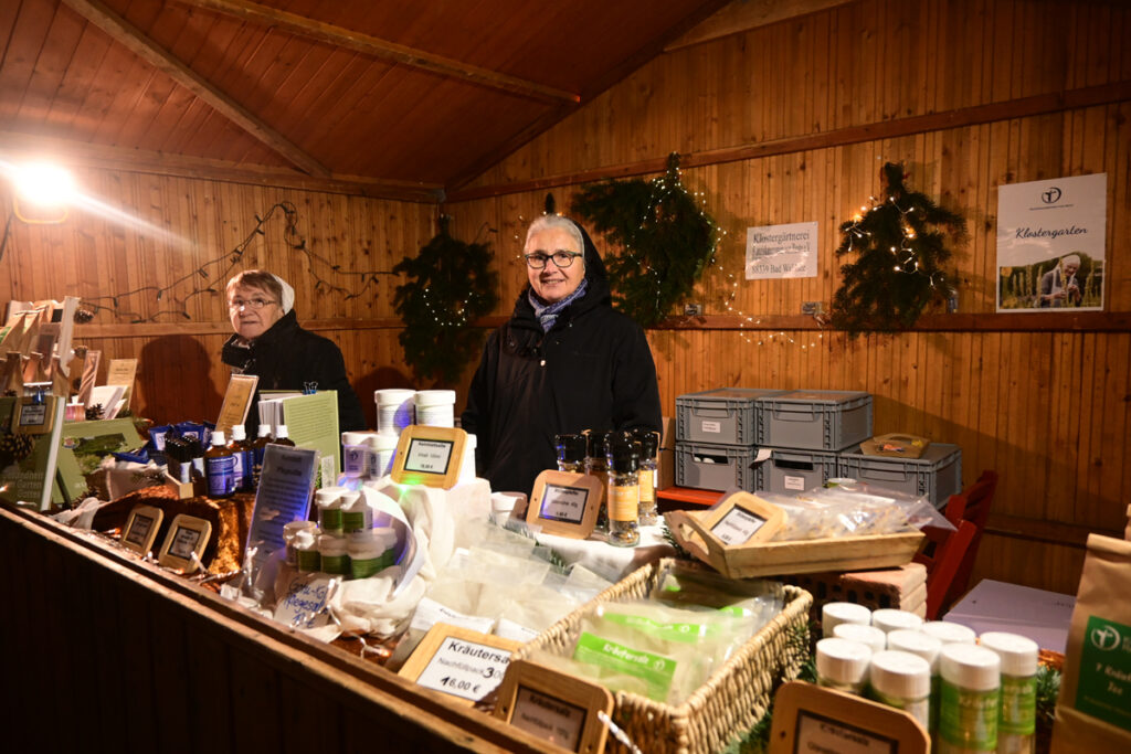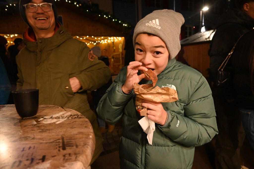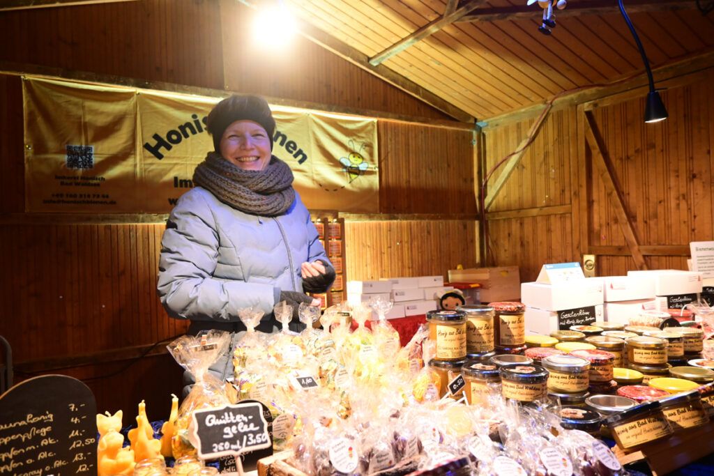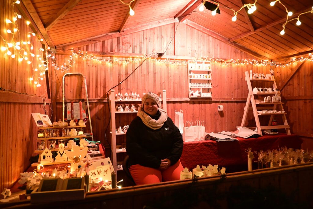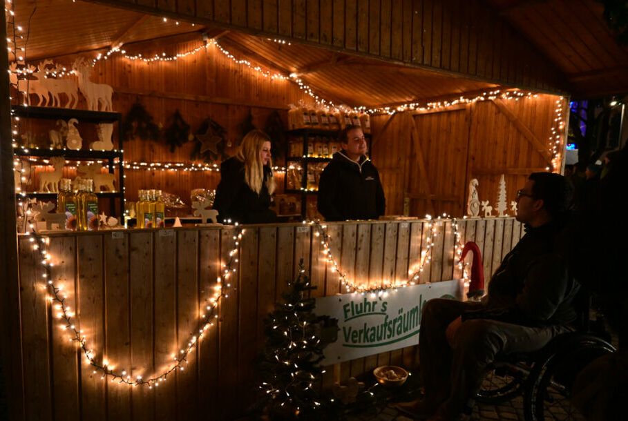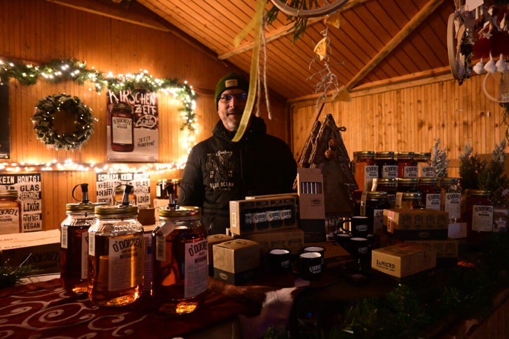 Zum Glühen wurde jede Menge gebracht. An erster Stelle roter und weiße Glühmost. Gut, um die Hände an der Tasse, den Körper und auch die Seele zu wärmen. Bratroste glühten und bräunten knusprige Rote und Weiße. Aus dem glühenden Backofen kamen leckere, knusprige Baumstriezel mit vielen süßen Toppings und aus dem glühenden Pizzaofen gab’s heiße Vinschgerln mit geschmolzenem Käse, Speck und Zwiebeln. Es glühten die elektrischen Lichter an den Verkaufsbuden und es glühten die Backen der Besucher vor Begeisterung. Wie immer bei den Weihnachtsmärkten gab es Schlangen vor den Getränkeständen, während es vor den Verkaufsbuden um 18.00 und 19.00 Uhr noch recht locker zuging. Trotzdem, auf Nachfrage zeigten die Händler sich zufrieden mit der Nachfrage. So fand doch noch das eine oder andere Weihnachtsgeschenk seinen Weg von der Hochstatt auf einen Gabentisch.