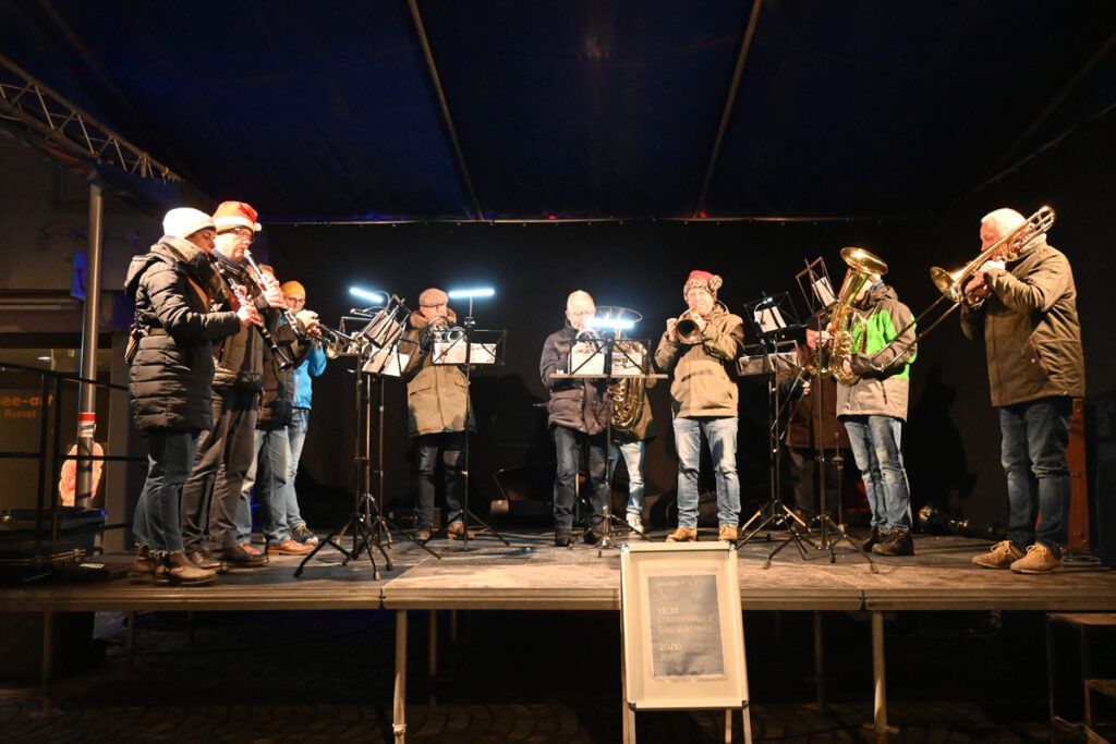 Bad Waldsee – Die Hochstatt erstrahlte im Lichterglanz der Verkaufsbuden. Von der Bühne erklangen die bekannten Weihnachtsmelodien. Vorgetragen von zehn Bläsern unserer Bad Waldseer Stadtkapelle. Trotz der Kälte hatten sich viele Leute eingefunden, um beim Adventsglühen dabei zu sein. Unser Berichterstatter Erwin Linder war am Freitag dabei. Das Adventsglühen findet heute noch bis 20.00 Uhr statt.