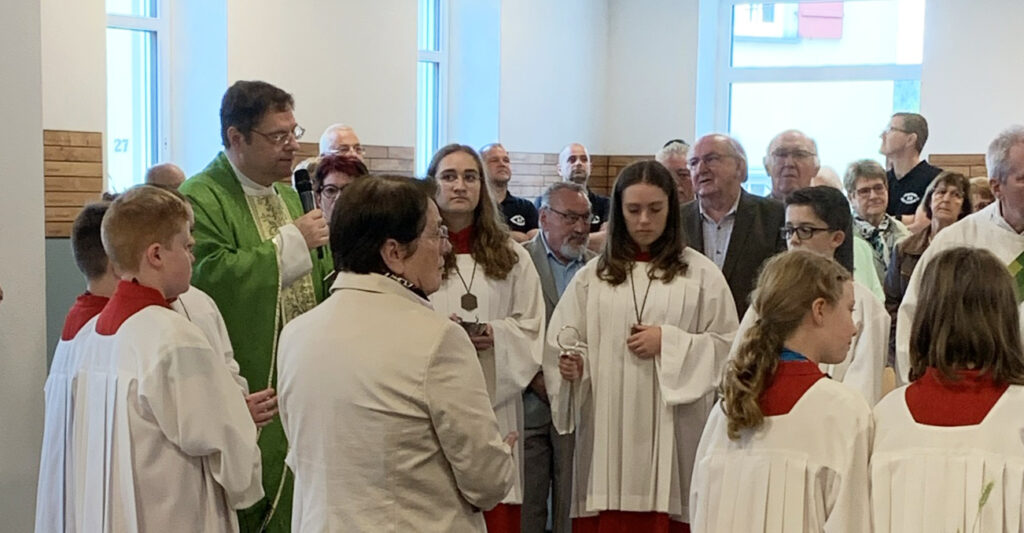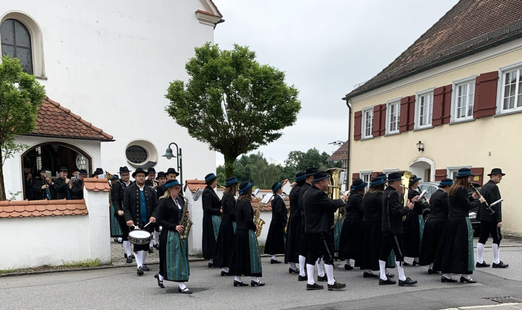 Entsprechend würdig, heiter und stolz war die Einweihung des neuen alten Dorfmittelpunkts. Dazu gab es einen Gottesdienst, zelebriert von Pfarrer Klaus Stegmaier in der gegenüberliegenden Kirche St. Jakobus. Angeführt vom Musikverein (Bild), verließen die Festbesucher das Gotteshaus, um in einer Art Prozession zum Dorfgemeinschaftshaus hinüberzuwechseln, unter ihnen die Verwaltungsspitze Wolfeggs, Fürst Johannes von Waldburg-Wolfegg zu Waldsee, Raimund Haser MdL und Axel Müller MdB. Empfangen wurde man mit Sekt. Schnell war der Saal voll besetzt und der Musikverein hatte seinen ersten Auftritt auf der großzügigen Bühne. Pfarrer Stegmaier mit Ministranten segnete und weihte das Haus und freute sich auf eine künftig gute Nachbarschaft mit einem Haus der Begegnungen für die Rötenbacher und für auswärtige Gäste.