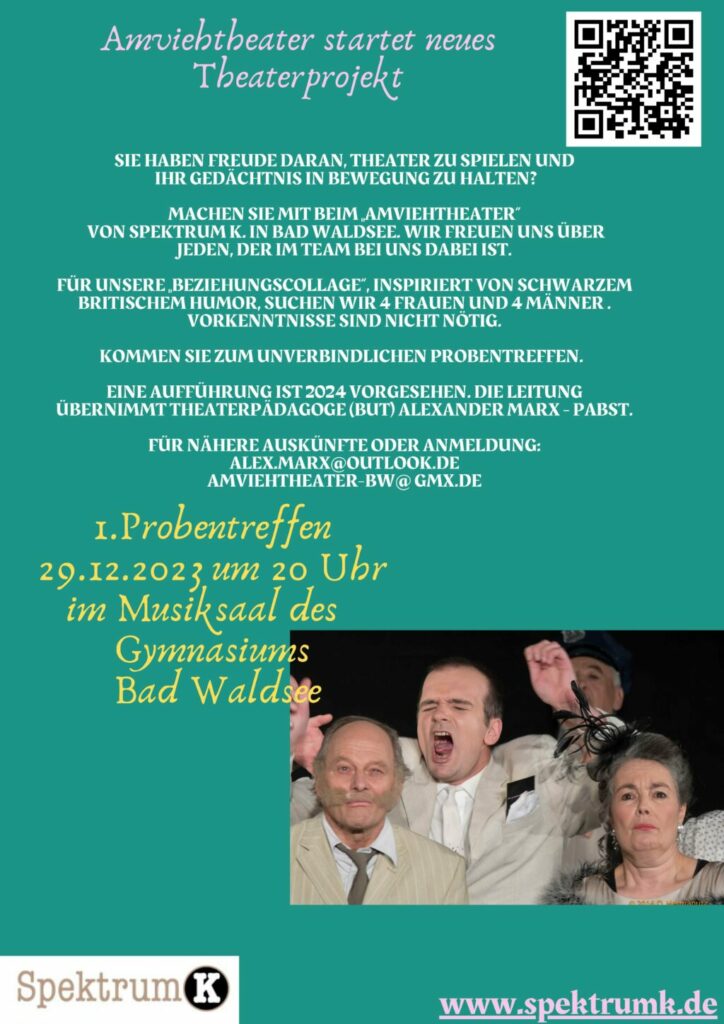 Bad Waldsee – Sie haben Freude daran, Theater zu spielen und Ihr Gedächtnis in Bewegung zu halten? Dann machen Sie mit beim Theaterprojekt „Amviehtheater“. Das erste Probetreffen findet statt am 29. Dezember um 20.00 Uhr im Musiksaal des Gymnasiums. Nachstehend veröffentlicht die Bildschirmzeitung ein Plakat mit detaillierten Informationen: