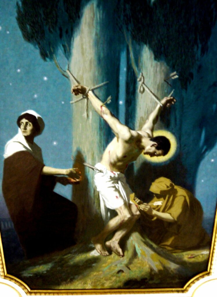 Das Deckengemälde (Ausschnitt) in der Sebastianskapelle stammt von dem renommierten Kunstmaler Gebhard Fugel, geschaffen im Zeitraum 1910/1912. Es zeigt, wie Günter Brutscher im Kapellenführer schreibt, die Abnahme Sebastians vom Marterpfahl, an dem er festgebunden war und mit Pfeilen schwer verwundet wurde. Links von ihm sieht man die heilige Irene, die der Überlieferung nach mit einer Getreuen den Gemarterten losgebunden und schließlich gesundgepflegt hat. Später wurde Sebastian, der sich weiterhin zum christlichen Glauben bekannte, in einer der Christenverfolgungen im Römischen Reich Anfang des 4. Jahrhunderts erschlagen und in die Cloaca Maxima in Rom geworfen.