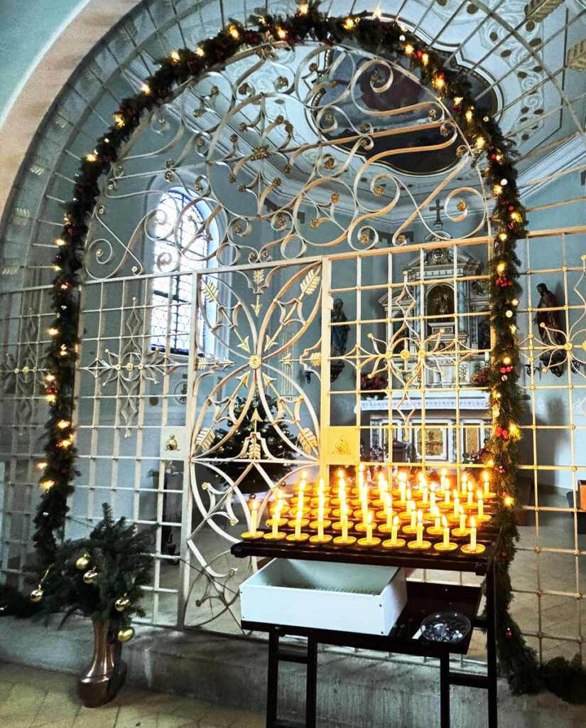 Der von Familie Groß angebrachte Bogenkranz. Unter dem vollbelegten Kerzenständer sieht man den Kerzenvorrat. Kerzenspender, die keinen Steckplatz mehr finden, legen die erworbene Kerze in einen separaten Kasten hinter dem Gitter. Die dort abgelegten Opferkerzen werden vom Mesnerehepaar dann nach und nach entnommen und am Kerzenständer entzündet. – Man beachte auch die Pfeile am Chorgitter: Sie erinnern an das Martyrium des heiligen Sebastian.