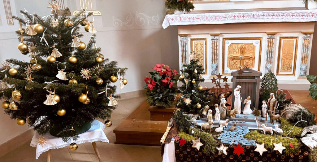Auch der gesamte Altarbereich (Bild) in der Sebastianskapelle ist wieder wunderschön gestaltet worden. Bernd und Rosmarie Schmid aus Hittelkofen haben wie die Jahre zuvor für den weihnachtlichen Schmuck Sorge getragen. Auch Familie Groß aus Osterhofen hat sich wieder helfend eingebracht und den prächtigen Lichterkranz am Altargitterbogen gespendet.