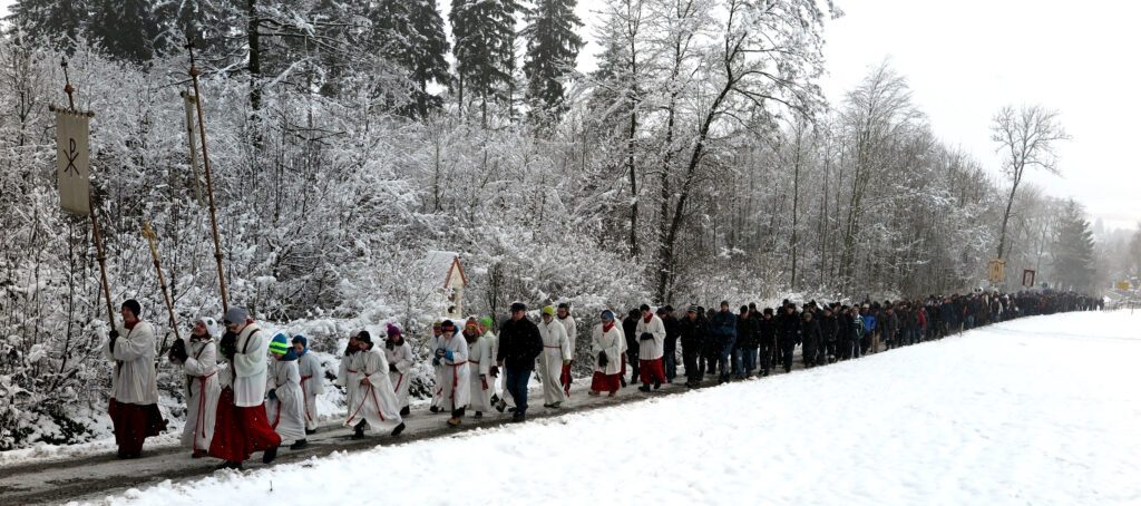 Die meisten „Bastiane-Pilger“ werden am Montag, 20. Januar, dem Gedenktag des Heiligen, gekommen sein. Viele von Haidgau her, auch über Graben und Hittelkofen. In Haisterkirch wurde in der Pfarrkirche St. Johannes Baptist um 9.00 Uhr ein Festgottesdienstes gefeiert. Prediger in der Festmesse war Pastoralreferent Benjamin Sigg aus Leutkirch. Er pflegt (neben vielen anderen Aufgaben in seiner Seelsorgeeinheit) das Netzwerk „Spiritualität-Pilgern-Tourismus“. „Er passt wunderbar zum Wallfahrtsthema in diesem Jahr, in dem ich das Motto des Heiligen Jahres aufgreife: Pilger der Hoffnung“, sagte im Vorfeld Bad Waldsees Pfarrer Stefan Werner. Anschließend zog die Haisterkircher Festgemeinde betend und singend in Prozession zur Kapelle hinauf. Dort wurde eine Wortgottesfeier in den Anliegen der Wallfahrer gehalten.