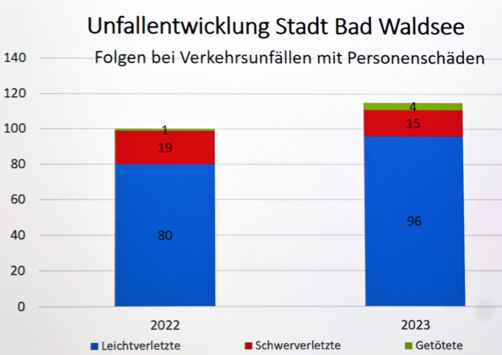 Auch die Zahl der bei Verkehrsunfällen im Stadtgebiet verstorbenen Personen erhöhte sich von einer getöteten Person auf vier. Die Zahl der Schwerverletzten nahm ab, von 19 auf 15, die der Leichtverletzten stieg von 80 auf 96 Personen.