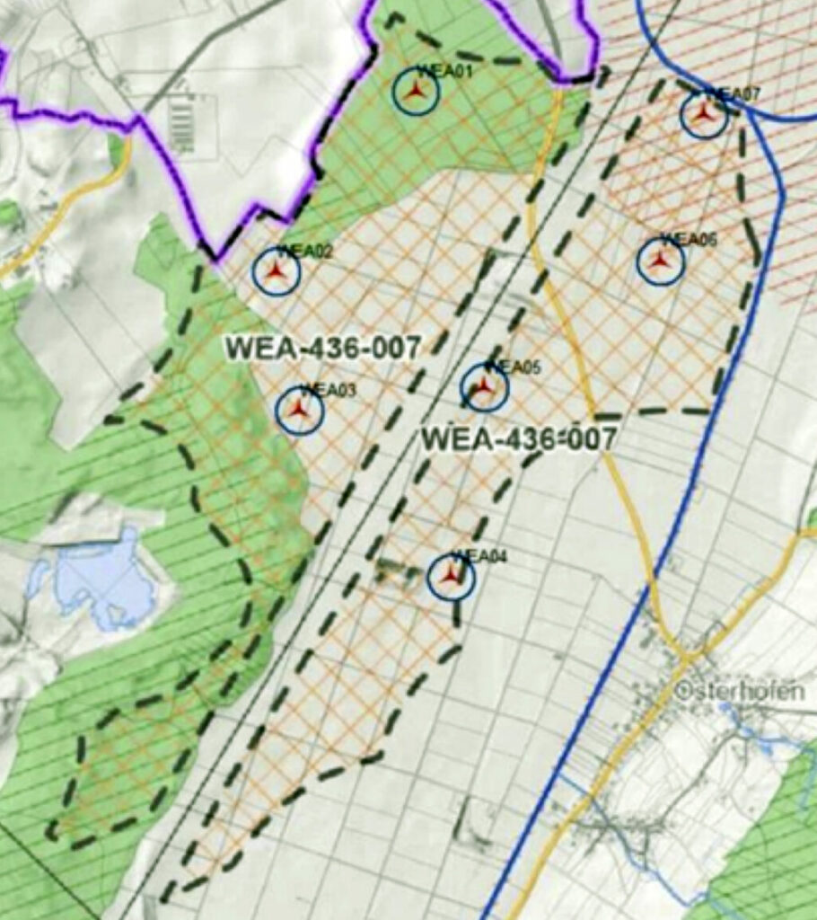 Auf der Planskizze Nr. 1 (Karte: Stadt) sind die projektierten sieben Windkraftanlagen dargestellt. Für die Anlage im Nordosten der vom RVBO ausgewiesenen Vorrangfläche wurde das Gemeindliche Einvernehmen versagt.  Aufgrund der Nähe zum Fauna-Flora-Habitat-Gebiet (FFH-Gebiet) im Bereich der Mauchenmühle und der Zielvorgabe des Regionalplans für ein Vorranggebiet für Naturschutz und Landschaftspflege im Nordosten kann aus Sicht der Stadt Bad Waldsee kein Einvernehmen erteilt werden. Außerdem liege nahe der Mauchenmühle ein Überschwemmungsgebiet vor. Die Stadtverwaltung lässt zunächst vom Projektierer ein entsprechendes Gutachten zum Überschwemmungsgebiet erstellen.