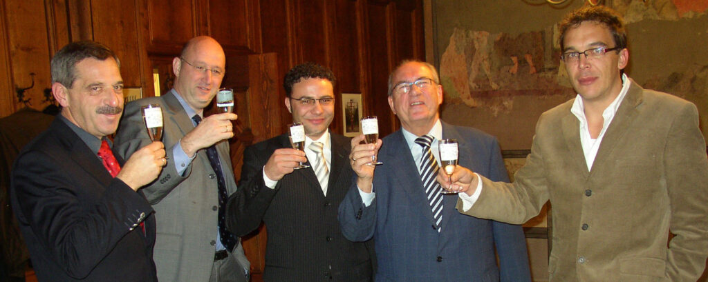 Unser Bild zeigt die Gründungsväter der „neuen“ OSG, die im April 2008 auf das Zustandekommen des Wasserversorgungsverbandes anstoßen – mit OSG-Wasser: Roland Weinschenk (Bürgermeister Bad Waldsee), Roland Bürkle (Bürgermeister Bad Wurzach), Peter Müller (Bürgermeister Wolfegg), Prof. Rudolf Forcher (Verbandsvorsitzender) und der technische Geschäftsführer Berthold Frech (von links). (rei) / RR-Archivbild (OSG)