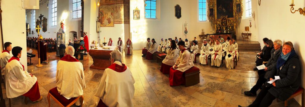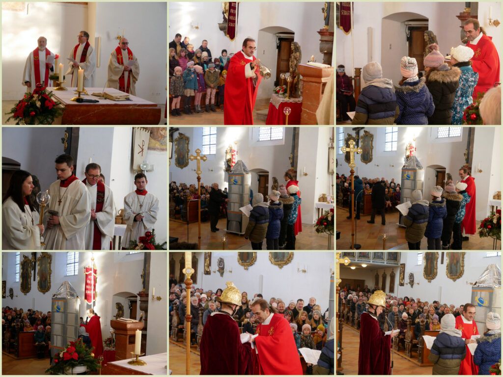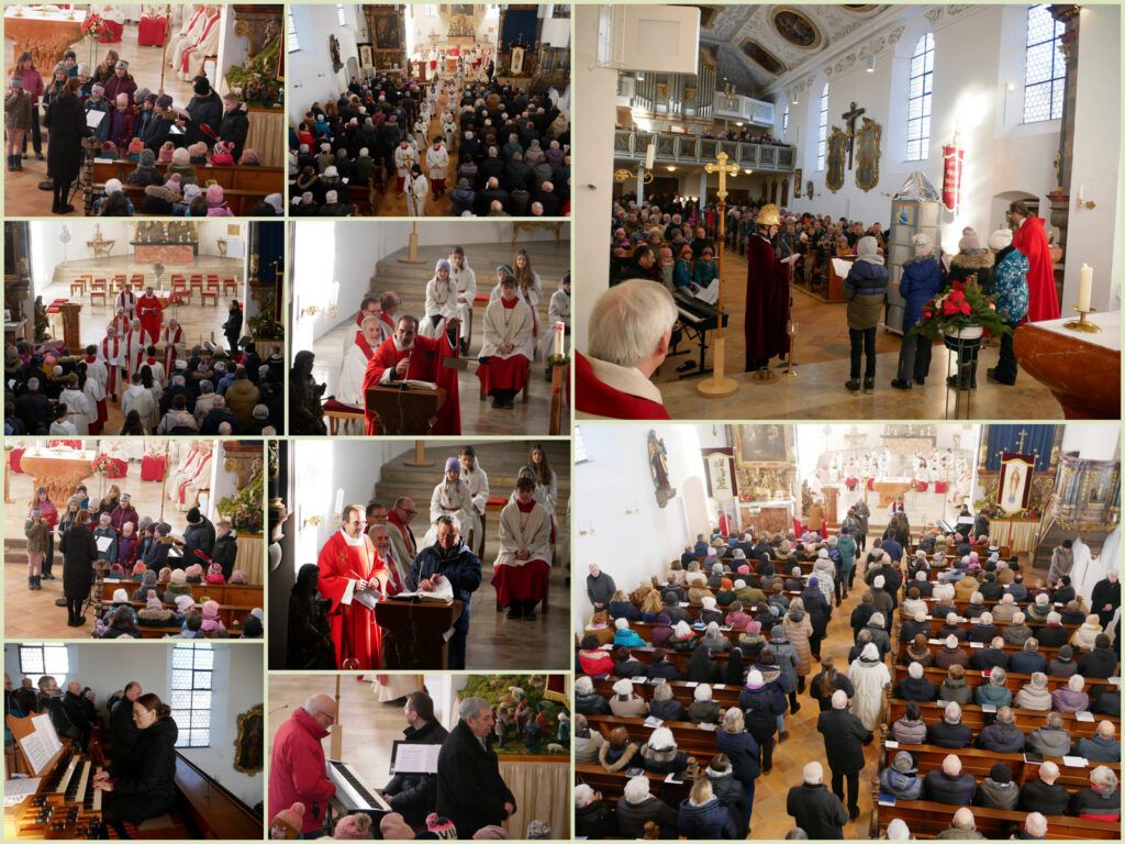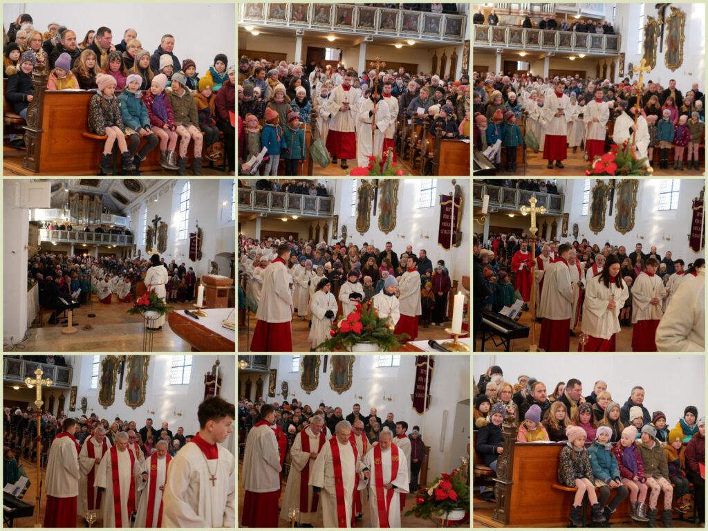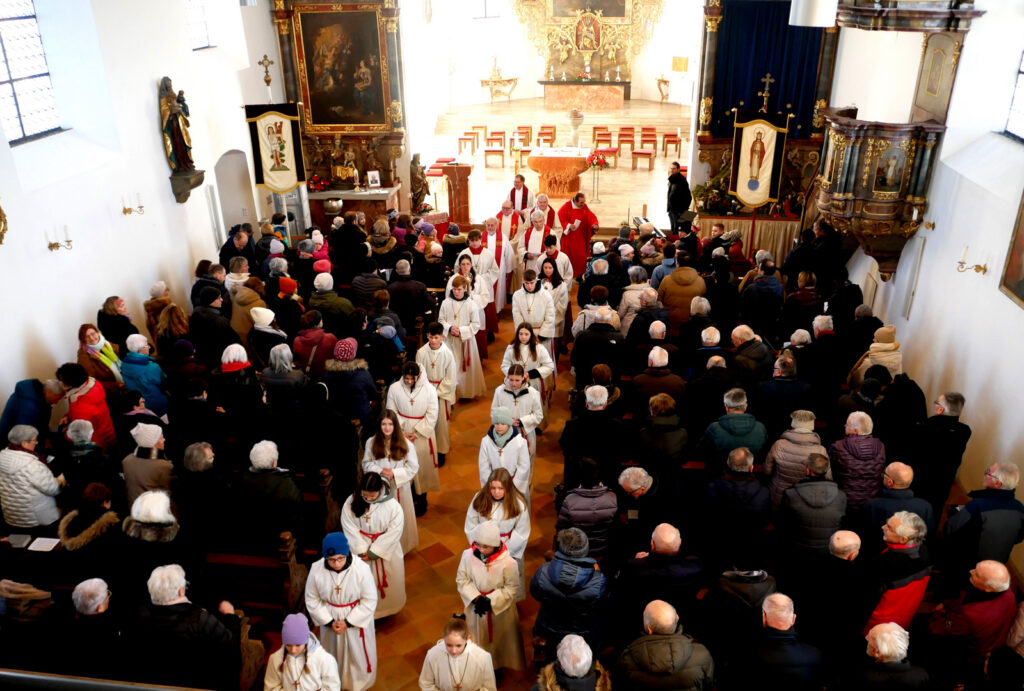 Voll belegt war die Pfarrkirche schon deutlich vor Beginn des Gottesdienstes. Das hing sicher auch mit dem schul- und arbeitsfreien Samstag zusammen. Begrüßt wurden die Gottesdienstbesucher vom Hauptzelebranten Pfarrer Stefan Werner, der zusammen mit weiteren fünf Priestern (Dekan i. R. Josef Mattes, Klosterpfarrer Uli Steck, Gottesberg-Superior Konrad Werder SDS, Pater Hubert Vogel SDS und Pfarrer Thomas Bucher) die Eucharistie feierte. Sie alle freuten sich darüber, dass auch Repräsentanten des Klosters Reute (Generalvikarin Sr. Rebecca Langer) und von kommunalpolitischer Seite Oberbürgermeister Matthias Henne, die Ortsvorsteherin Rosa Eisele (Haisterkirch), die Ortsvorsteher Achim Strobel (Reute-Gaisbeuren) und Ortsvorsteher Franz Spehn (Mittelurbach) sowie weitere kommunalpolitisch Engagierte zur großen Schar der Gottesdienstbesucher gehörten. Auch Minister a. D. Rudi Köberle kam wie all die Jahre zuvor nach Haisterkirch.