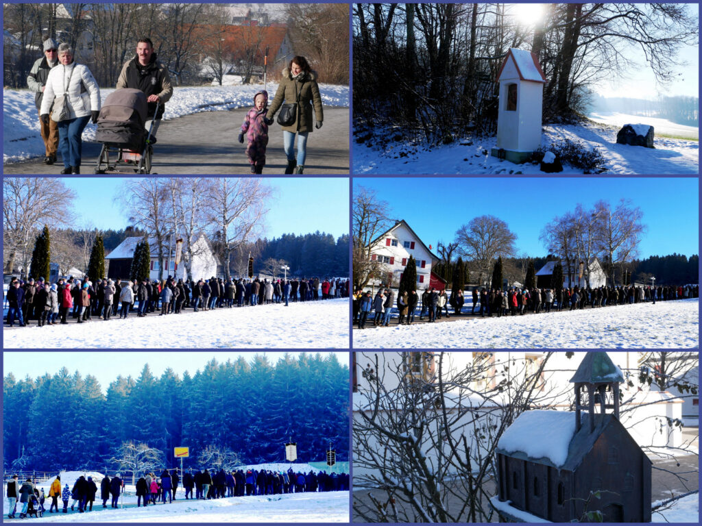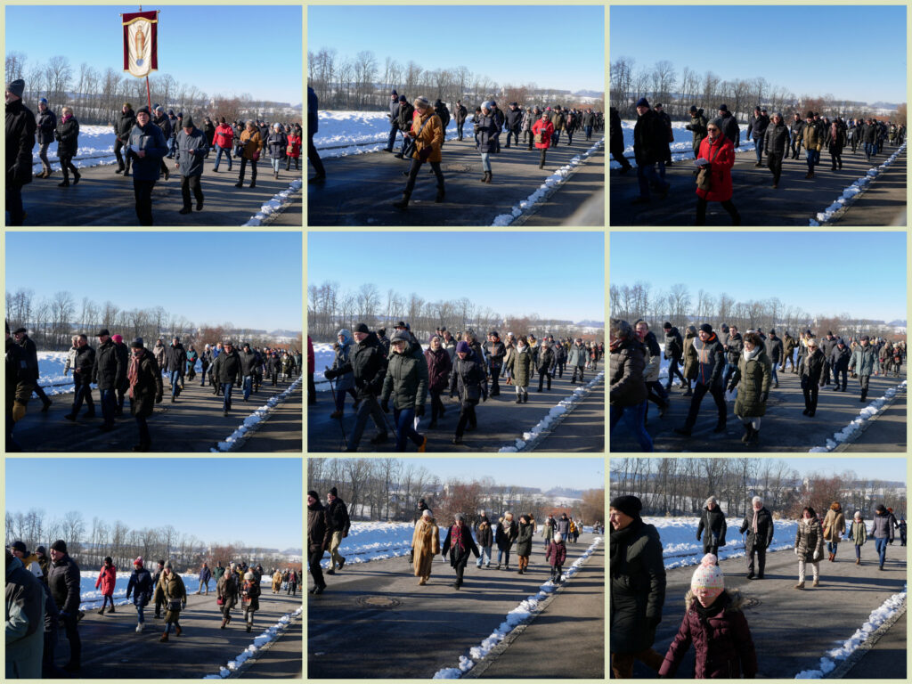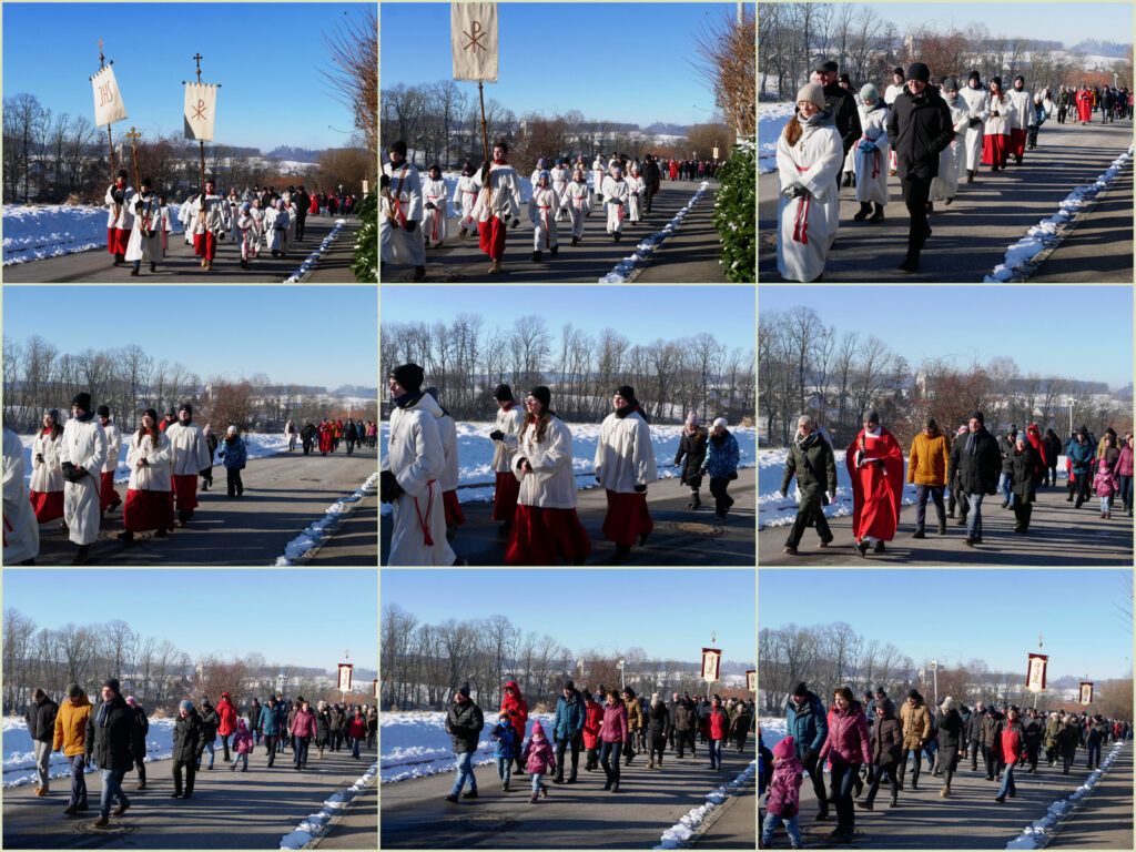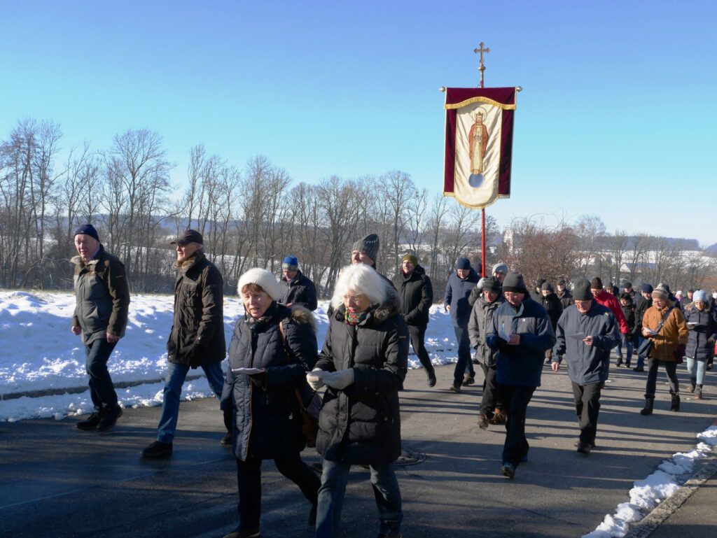 Erfreut zeigten sich alle, die den Hauptweg (Stationenweg) von Haisterkirch aus hinaufgegangen sind, denn die Stadt Bad Waldsee hat diesen noch rechtzeitig vor dem Sebastiansfest perfekt herrichten lassen. Auch der andere Hauptweg von Haidgau her war gut begehbar, so auch für die Beterinnen und Beter aus Arnach unter traditioneller Führung von Hansjörg Schick.