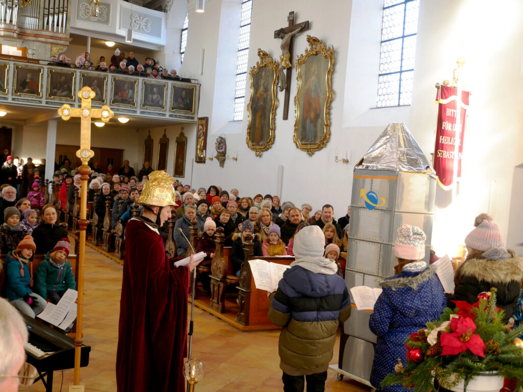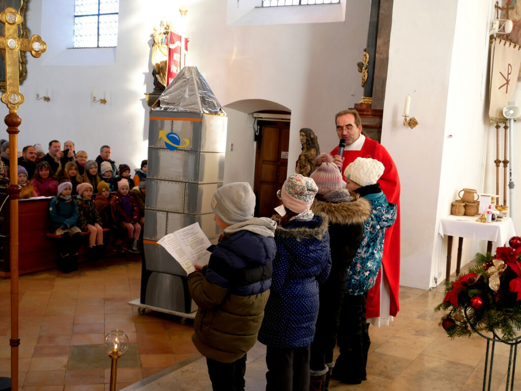 Mit einer silberfarbenen Rakete wurden die Kinder in die Zeit des Heiligen Sebastian „zurückgebeamt“. Im Dialog mit Pfarrer Werner wurde die Person des kaiserlichen Offiziers und bekennenden Christen Sebastian deutlich.