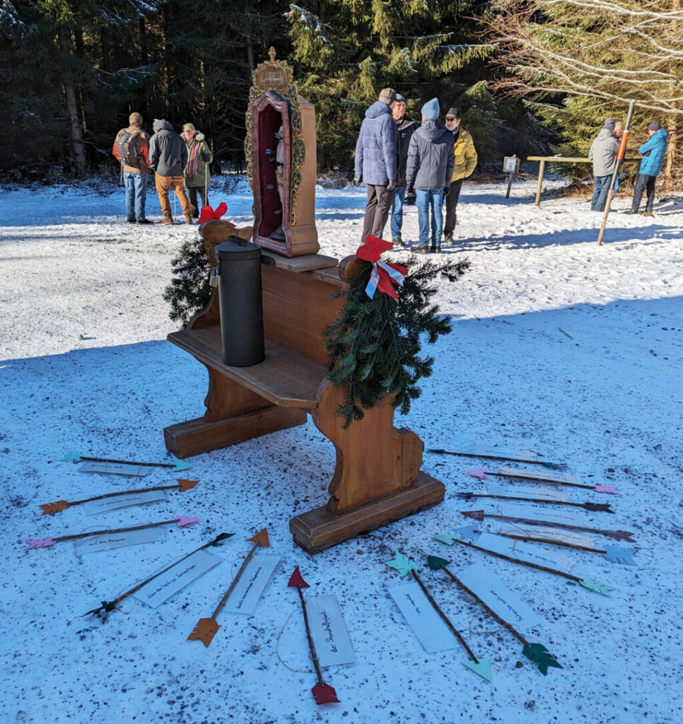 Pfeile sind – in Erinnerung an sein Martyrium – das Attribut des Heiligen Sebastian bei künstlerischen Darstellungen. Bei der Prozession am 20. Januar gab es ein Suchspiel für Kinder. Am Wegesrand waren hinter Bäumen und im Gebüsch Pfeile versteckt, an denen Zettel mit Wörtern und Satzbestandteilen hingen. Die Pfeile wurden von Kindern alle gefunden und oben vor der Kapelle an diesem „Opferstock“ in sinnvoller Reihenfolge niederlegt. Zusammen ergaben sie einen den Heiligen Sebastian würdigenden Satz. rei / Foto: Rosa Eisele