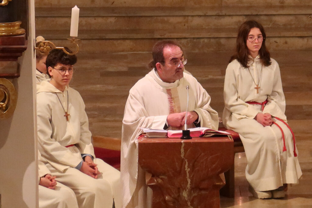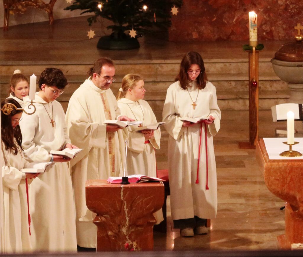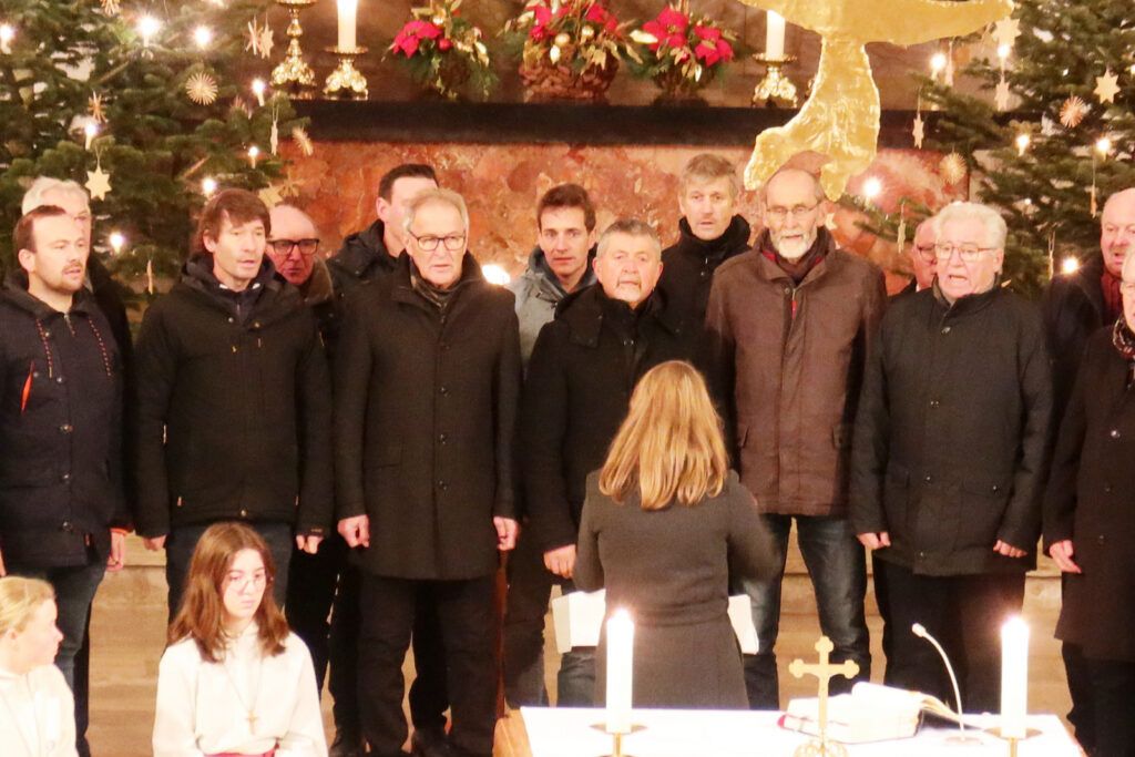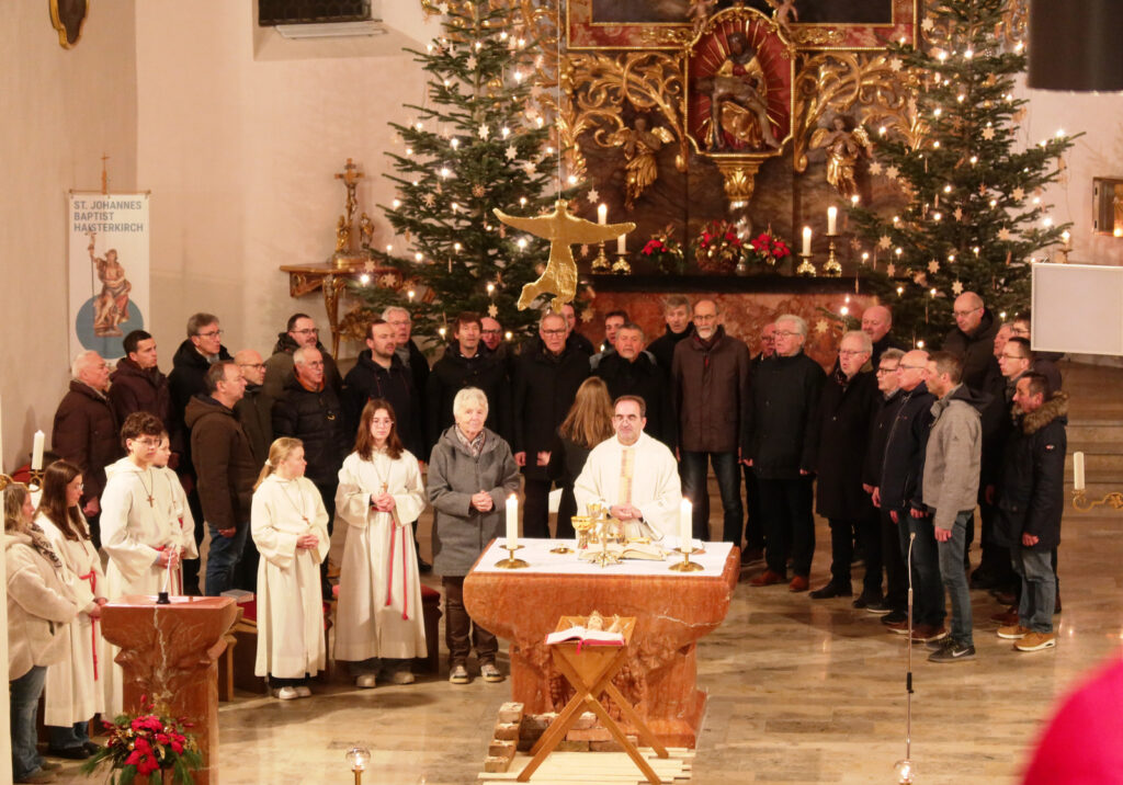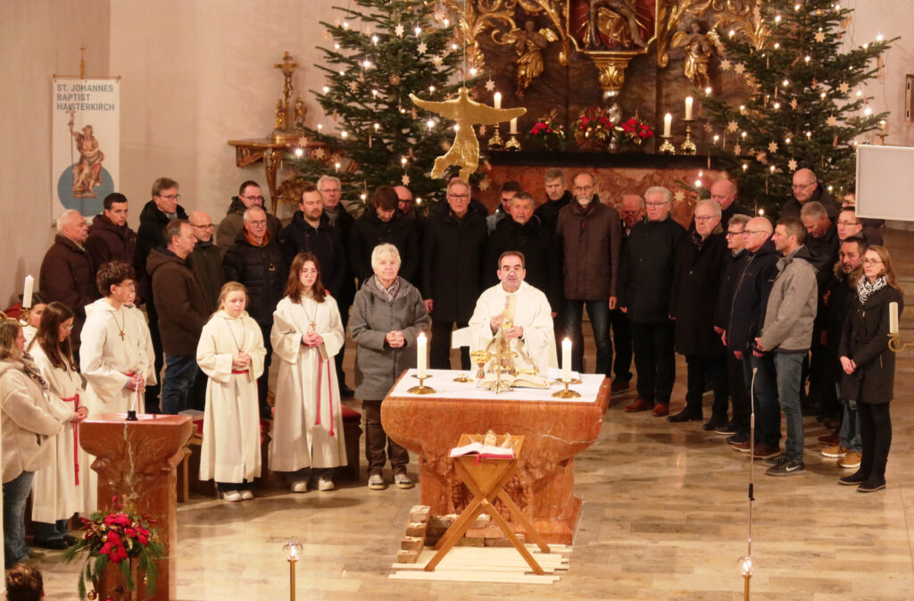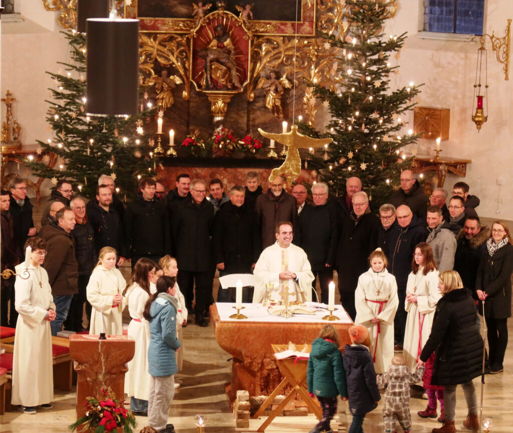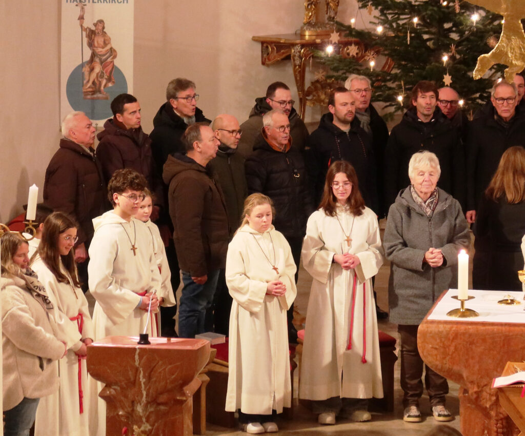 Der festliche Charakter des Gottesdienstes wurde durch ein außergewöhnliches, großartiges, musikalisches Angebot hervorgehoben. Denn zur Umrahmung der Eucharistiefeier wurde eine wahrlich vielfältige Klangwelt im Gotteshaus geboten. Gleich drei engagierte Musikgruppen aus Haisterkirch gehörten dazu. Beteiligt waren auf der Empore ein Bläserensemble des Haisterkircher Musikvereins unter Leitung von Klaus Wachter und auch der Sing- und Instrumentalkreis Haisterkirch war oben auf der ersten Empore. Im Altarraum befand sich der Männerchor Haisterkirch unter Leitung von Katrin Reichle. Das Zusammenwirken aller drei musikalischen Gruppierungen war gut abgestimmt worden. So wurde die Eucharistiefeier an Neujahr erneut zu einem musikalischen Festgenuss. Anhaltender, großer Beifall war Lohn für all die Sängerinnen, Sänger und Musizierenden, die Lektorinnen, die Minis und natürlich auch für Pfarrer Stefan Werner.