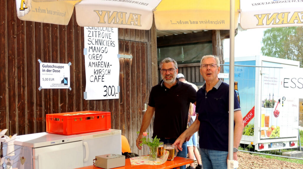 Das Vorstandsteam des Fördervereins „Kapelle Osterhofen“ war erneut im Dauereinsatz. So bemühten sich Markus Schmid (1. Vorsitzender) und Franz Maucher (Vorstandsmitglied) gespendete Dosen mit Gulaschsuppen und auch Q-Eis in Bechern an Frau und Mann und Kinder zu bringen.