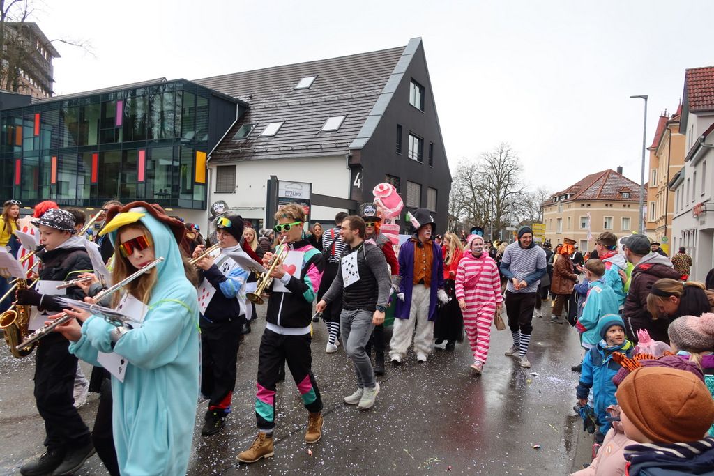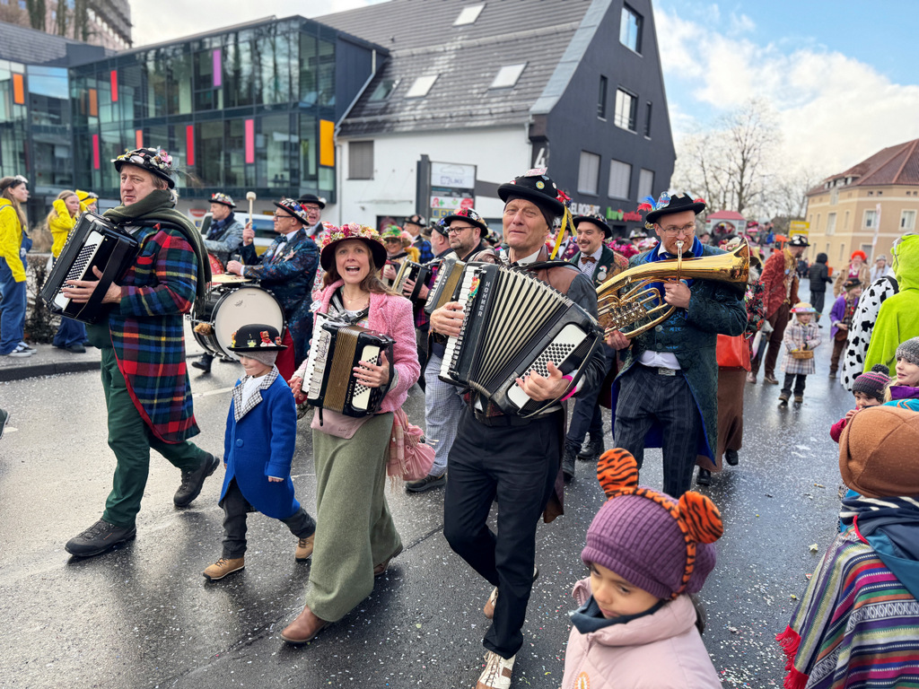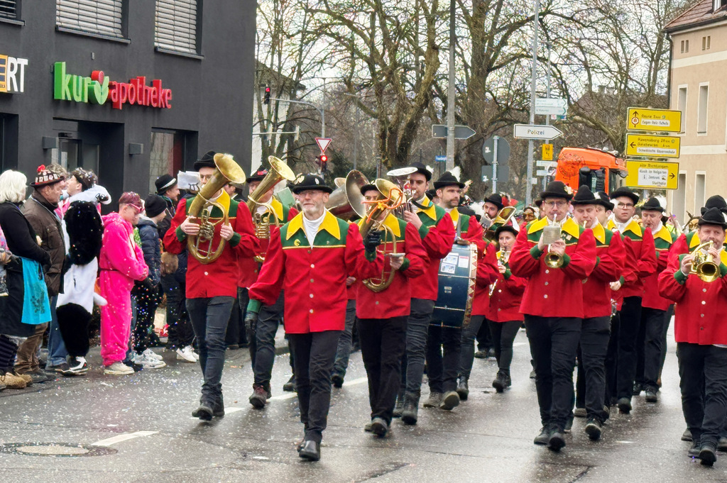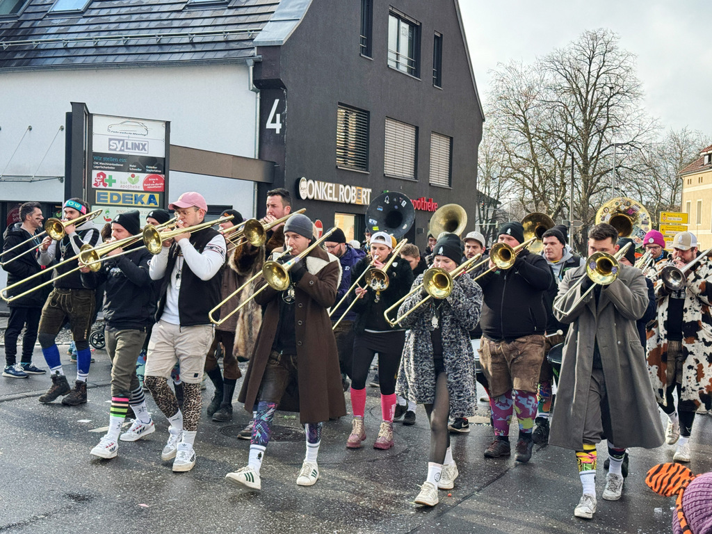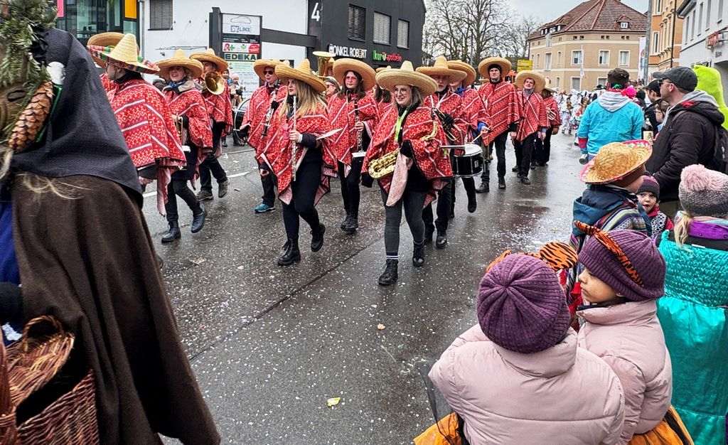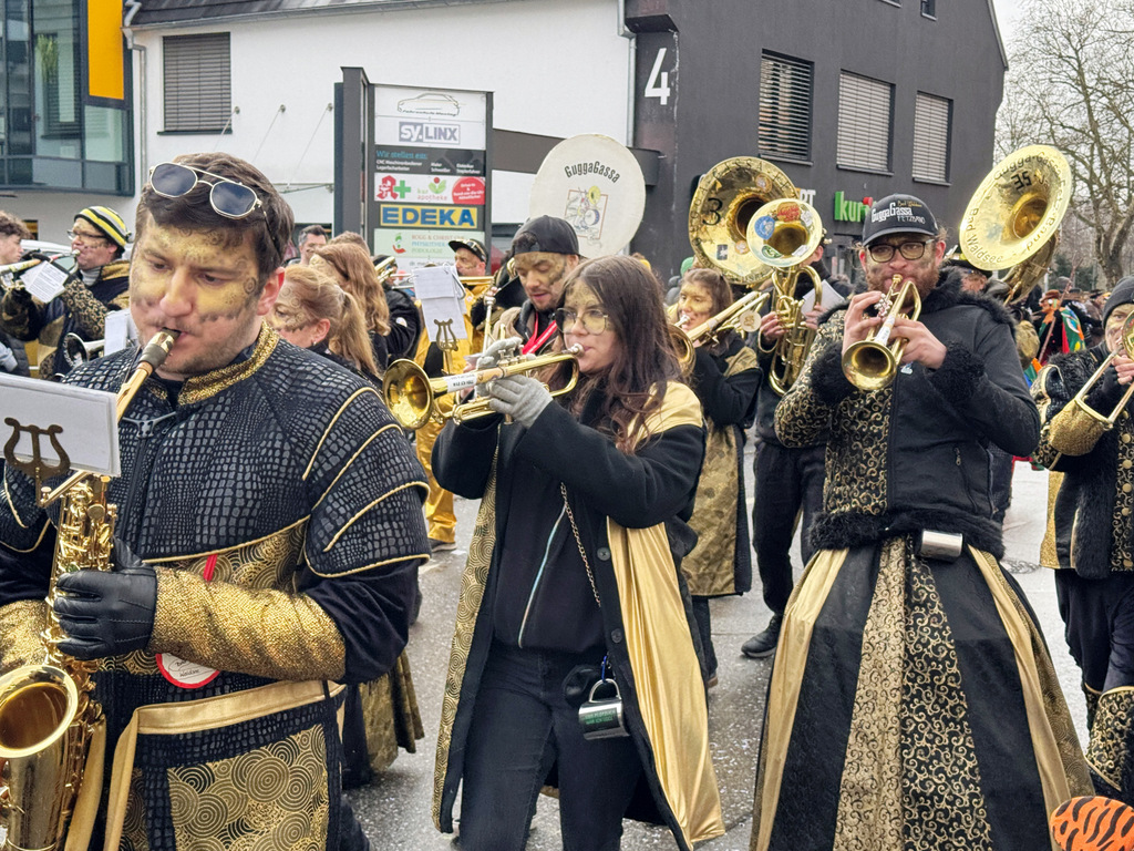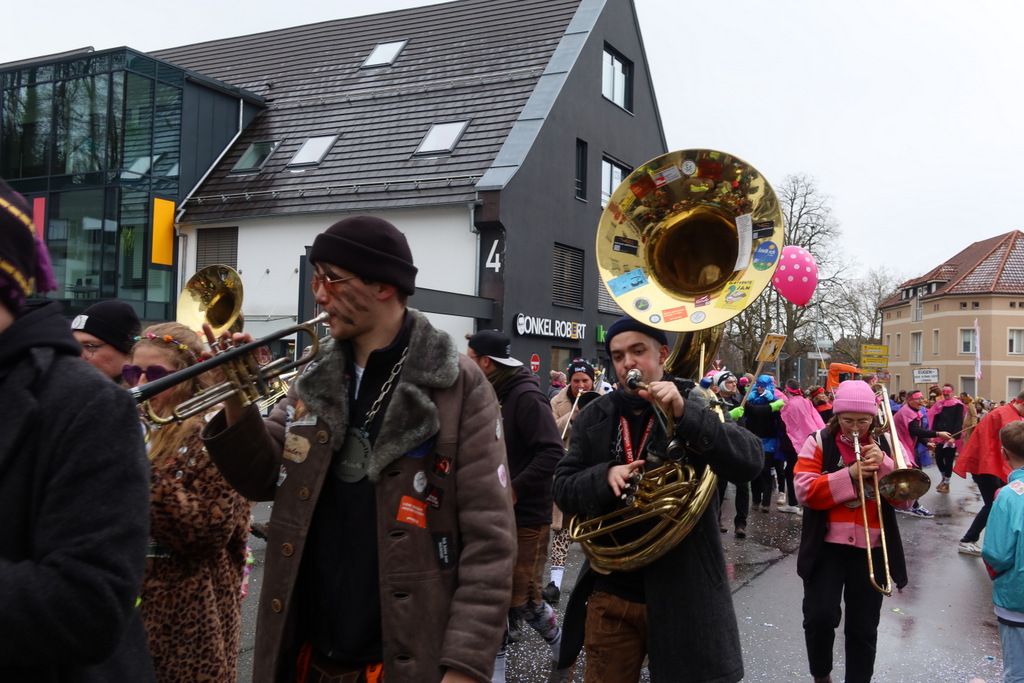 Mit fetzigen Klängen brachten die verschiedenen Musikgruppen viel Bewegung in die riesengroße Schar der Närrinnen und Narren und in die Zuschauerreihen.