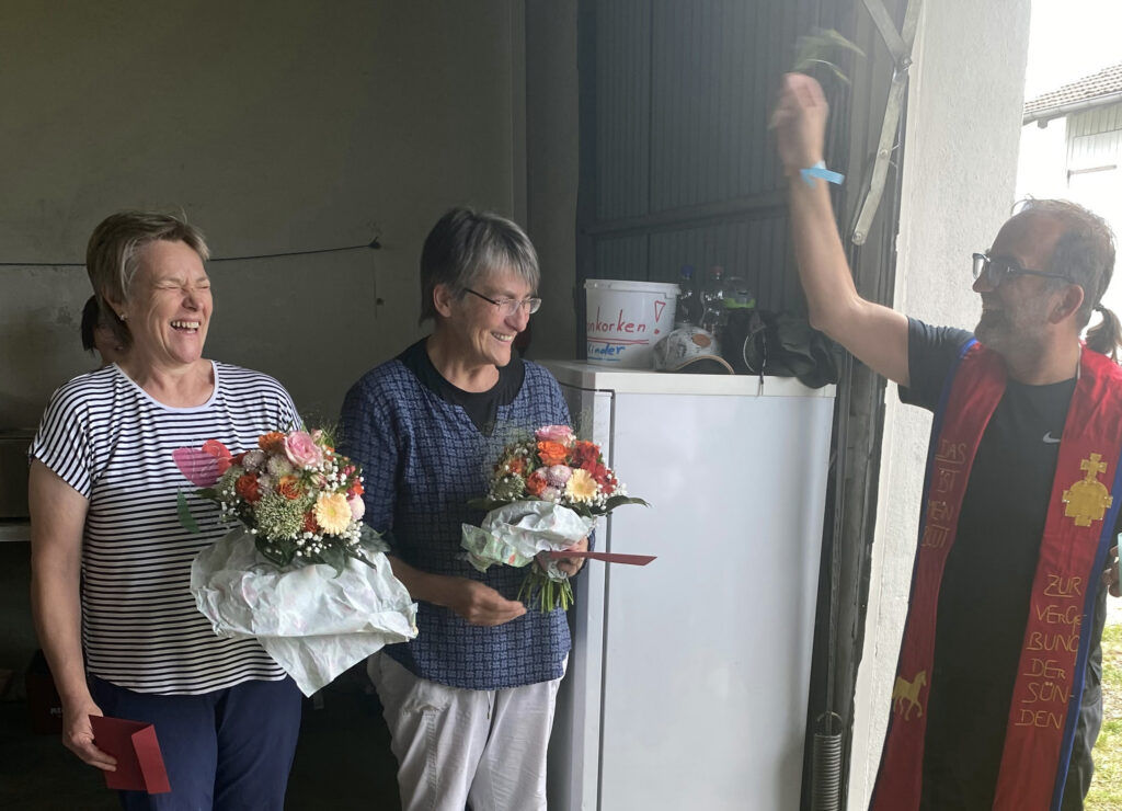 Höhepunkt war die Danksagung an die Familie Miller, bei der die Blutreitergruppe seit 40 Jahren Gast auf dem Hof sein darf. Für Gruppenführer Andy Hertkorn, der seit 39 Jahren Gast bei Familie Miller ist, wurde der Hof, dank der überwältigenden Gastfreundschaft, zu einer zweiten Heimat. Die beiden Töchter Gabi Reiser und Martina Miller erhielten Blumensträuße und Geschenkgutscheine für ihre herzliche Gastfreundschaft. Pfarrer Werner segnete beide (Bild) und das Anwesen, auf dass dieses noch lange die liebgewonnene Gastfreundschaft ausstrahlen möge.