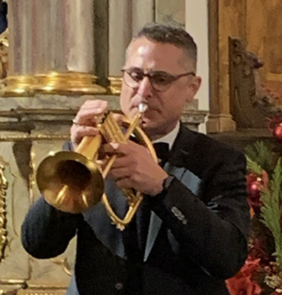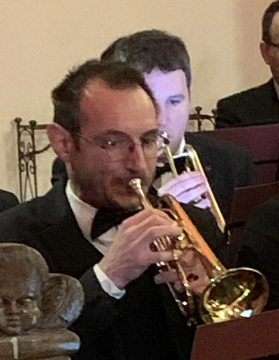 Im nächsten Titel „Intrada – Ein‘ feste Burg ist unser Gott“ (Ray Farr) konnten höchst anspruchsvolle Improvisationen des ursprünglich von Bach vertonten Chorals erlebt werden sowie eine spannende Verbindung von traditioneller Frömmigkeit mit modernen Rhythmen. Das strahlende Kornettregister führte ein, dabei waren gekonnte Soli von Markus Elser (Bild) zu hören. Dieses Register verband elegant zu Bariton, Euphonium, Posaunen mit Druck und Schwung, Tuben und Schlagwerk, wobei das tiefe Blech besonders einfühlsam den bekannten Choral einspielte.