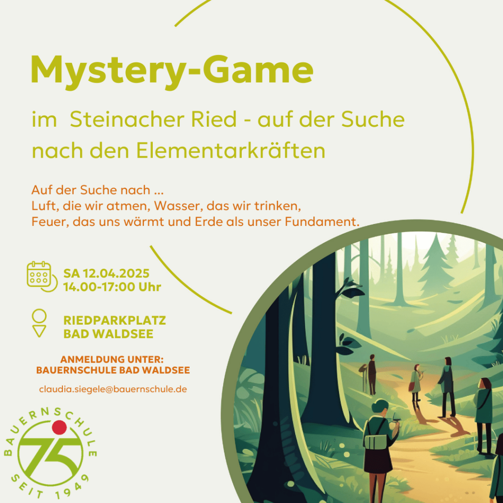 Bad Waldsee – „Mystery-Game im Steinacher Ried – auf der Suche nach den Elementarkräften“ – so wirbt Claudia Siegele für ein Naturerlebnis der besonderen Art. Auf der Suche nach … Luft, die wir atmen, Wasser, das wir trinken, Feuer, das uns wärmt und mit der Erde als unser Fundament. Am Samstag, 12. April, 14.00 Uhr bis 17.00 Uhr. Die Teilnehmer treffen sich am Riedparkplatz. Anmeldung bei der Bauernschule unter claudia.siegele@bauernschule.de.