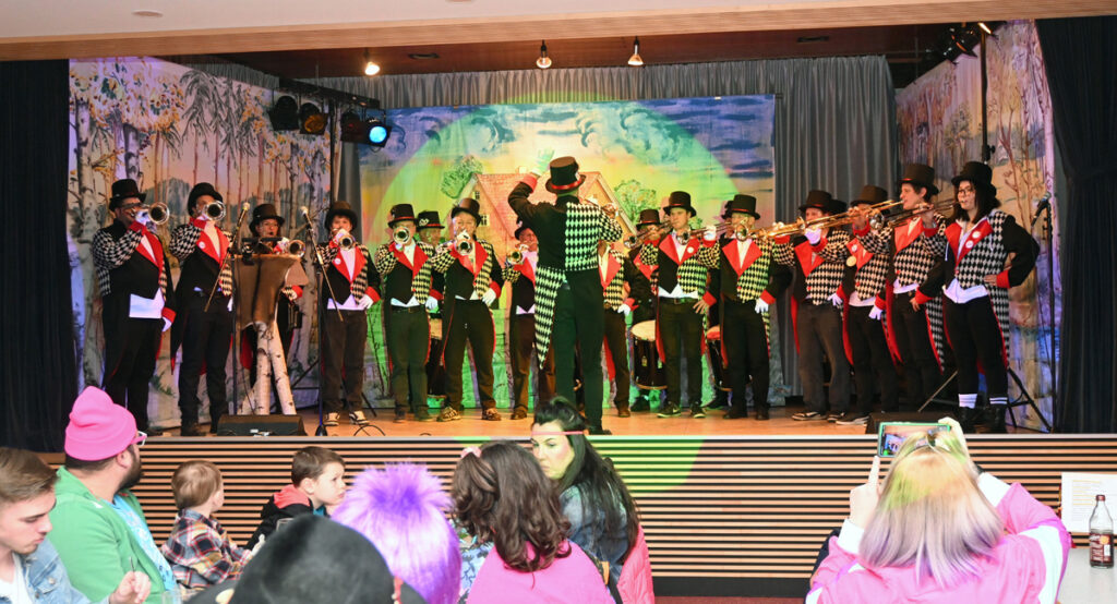 Dann wurde es lautstark. Der Fanfarenzug, schmuck gekleidet in schwarze Fräcke mit eingesetzten schwarz/weißen Rautenmustern, marschierte in den Saal. Vorne weg die Fahnenschwinger, die sich links  von der Bühne positionierten. Trommler und Bläser auf der Bühne intonierten lautstark die Fasnetsfanfaren, hauten auf die Trommeln, dass es in den Ohren krachte und wer vorher noch nicht bei  der Sache war, jetzt war er geweckt. Schwerstarbeit für ein schönes buntes Bild hatten die Fahnenschwinger zu leisten. Gut gemacht, Jungs und Mädel.