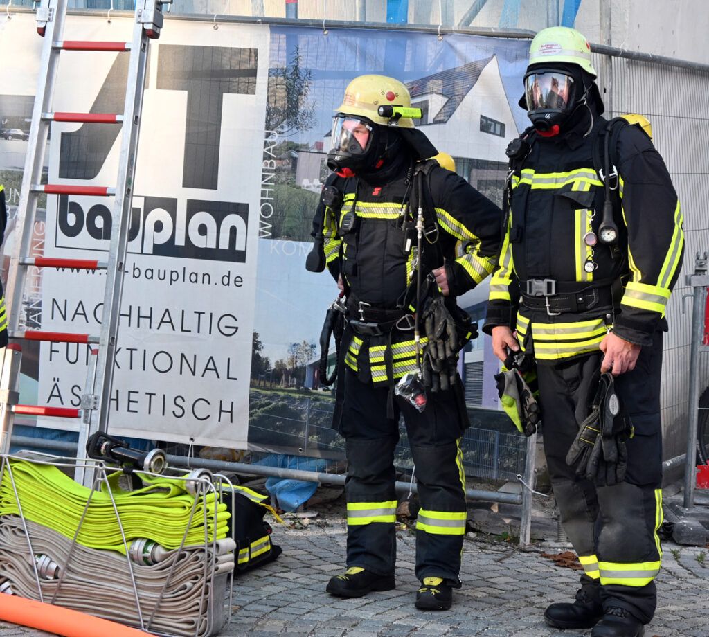 Dann ging’s es Schlag auf Schlag, Fahrzeug auf Fahrzeug. Gerätewagen, Mannschaftswagen , Drehleiter – der Platz vor dem Gebäude füllte sich im Handumdrehen mit Einsatzfahrzeugen. Die Blaulichter zuckten, die Feuerwehrleute rollten Schläuche aus. Spezialeinsatzkräfte mit Atemschutz machten sich bereit. „So 15 bis 20 Kilo schleppen wir schon mit uns rum“, gab einer hinter seiner Atemmaske Auskunft. „Bei mir sind’s 30 Kilo mehr“, scherzte sein fülliger Kamerad.