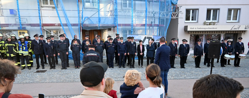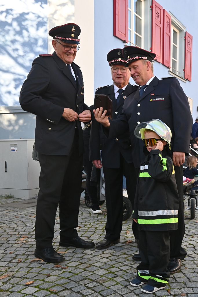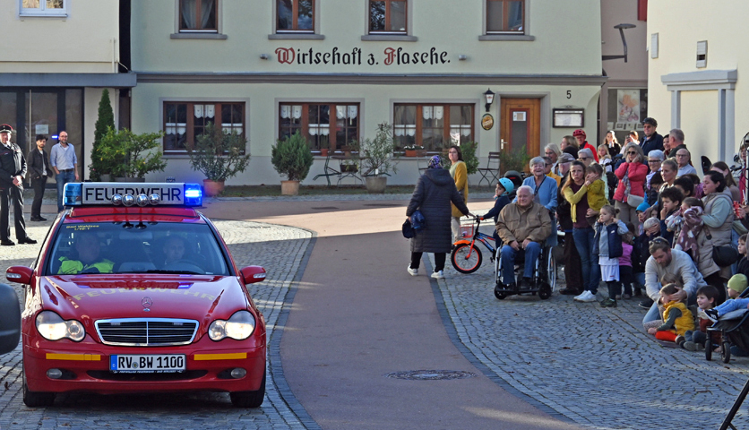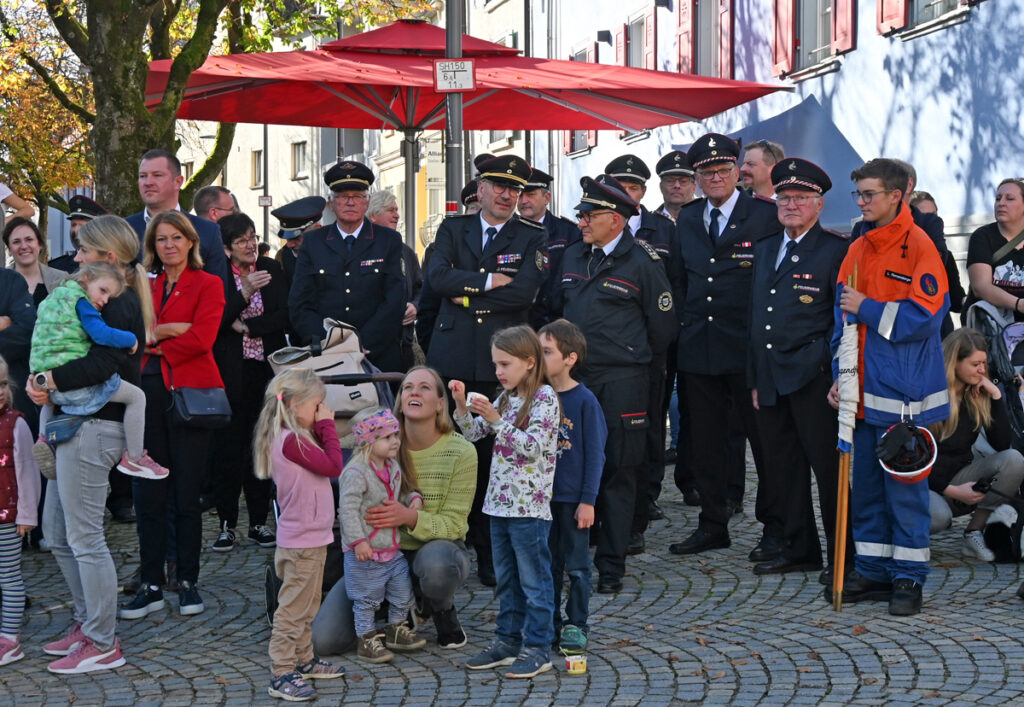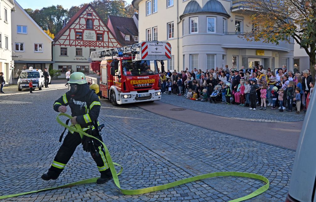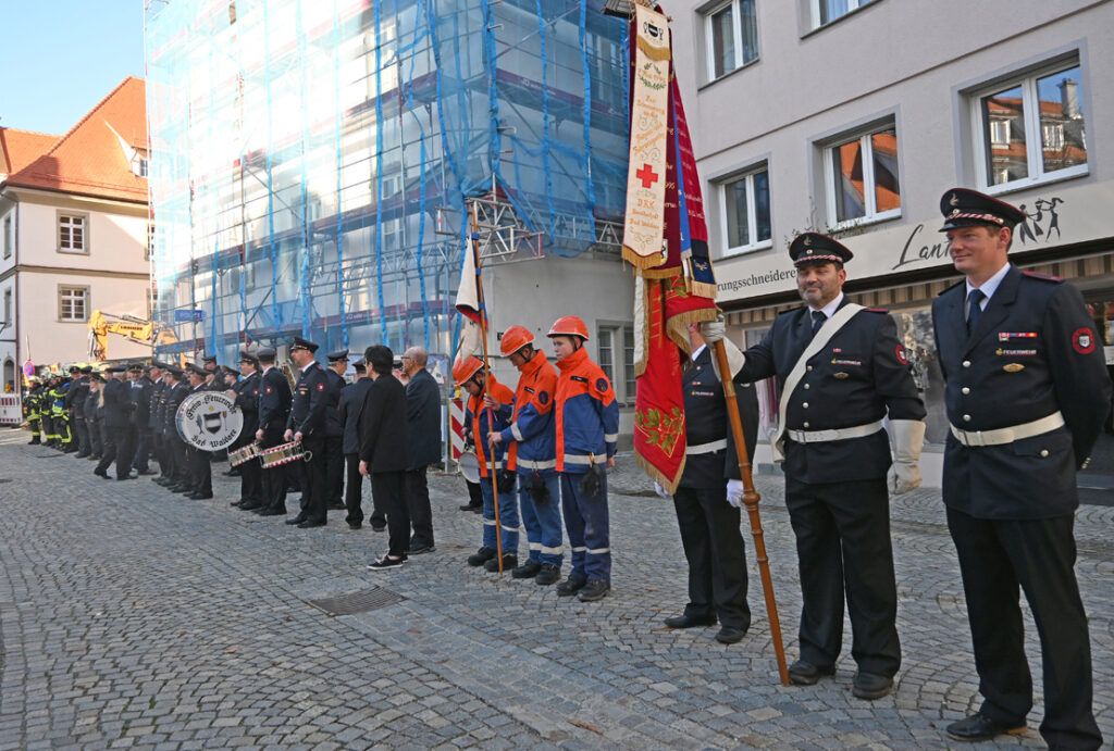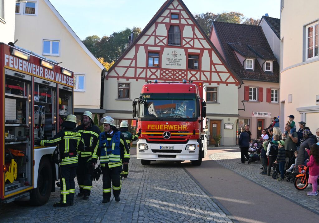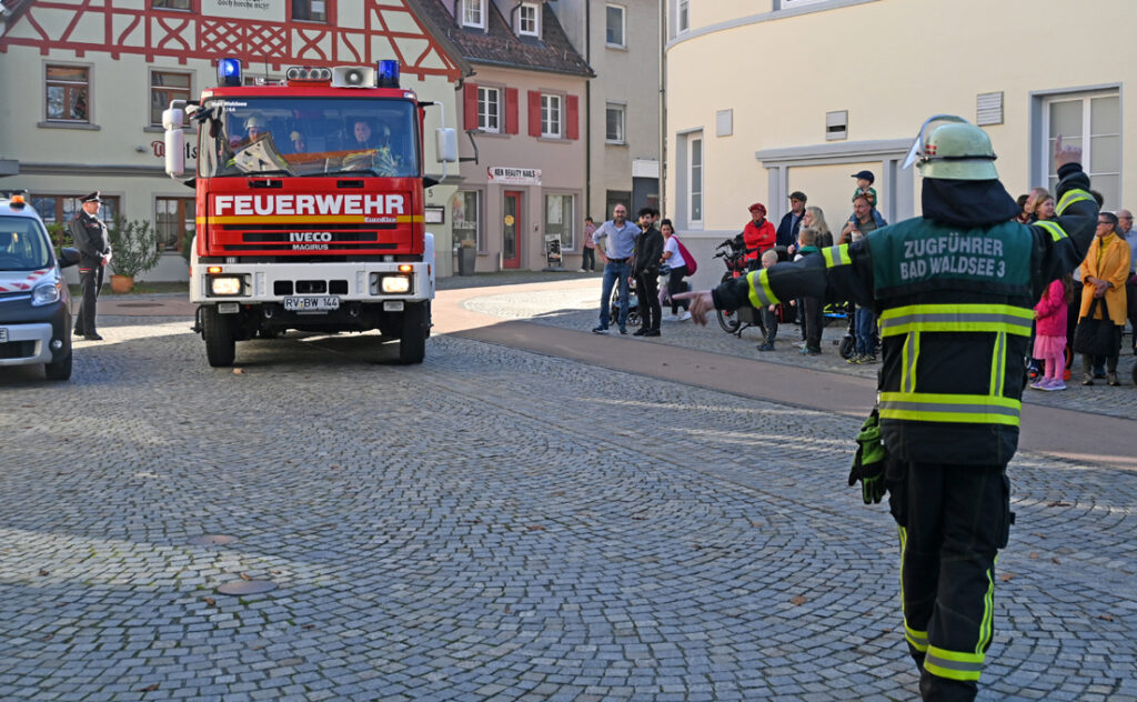 Die aktiven Wehrmänner und jene Uniformträger, die heute (21.10.) nicht im Einsatz waren, sowie der Spielmannszug formieren sich hinter der Fahne zum Appell. Markig befiehlt der Bad Waldseer Kommandant Alois Burkhardt: „Augen, geradeaus!“ Die Wehrmänner stehen stramm vor ihrem Dienstherrn Oberbürgermeister Henne. Wie immer findet der die richtigen, lobenden Worte für „seine“ Wehr. „Ihr habt eine wunderbare Leistung abgeliefert und gezeigt, dass die Lehrgänge und die vielen Übungsstunden auch in die Praxis umgesetzt werden können.“ Dafür bedanke er sich im Namen der Bevölkerung und des Gemeinderates und er versprach auch in Zukunft den Rückhalt des Rates, wenn neues Gerät notwendig würde.