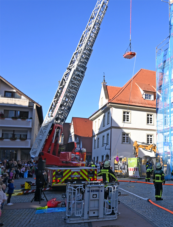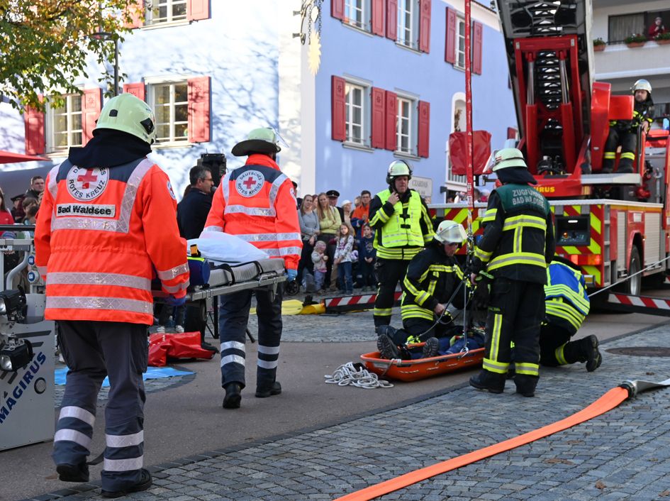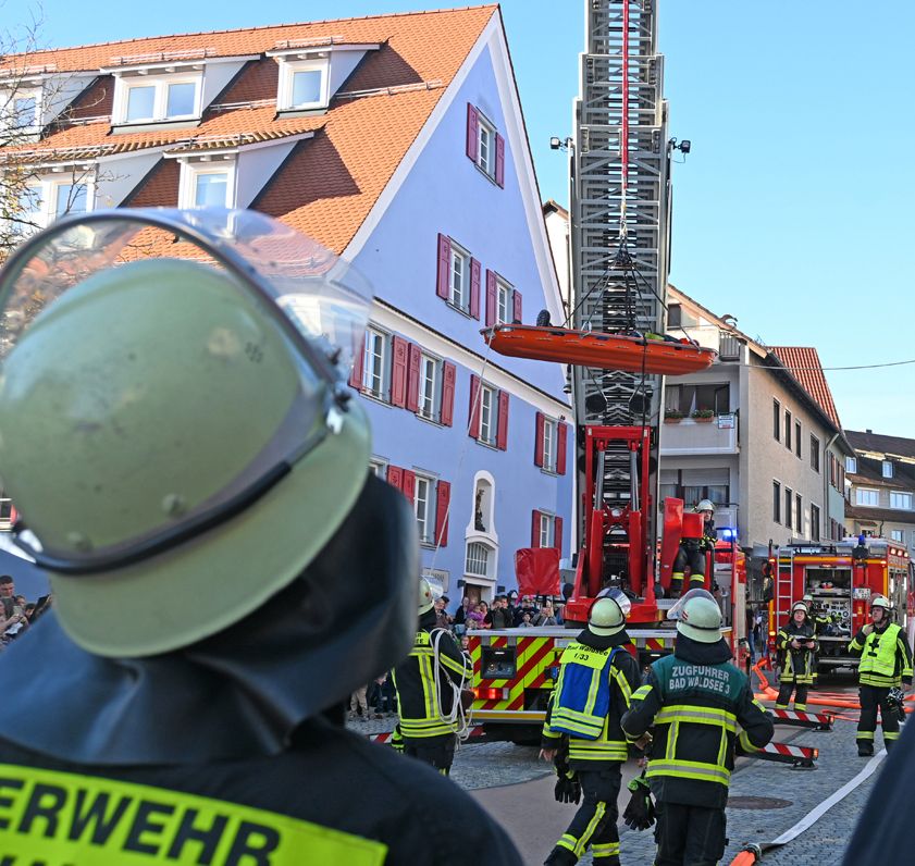 Es waren noch keine fünf Minuten vergangen. Zwei Mann mit Spezial-Kletterausrüstung enterten das Baugerüst. „Da haben sich die Waldseer eine knifflige Situation rausgesucht“, kommentierte Oliver Surbeck, Kreisbrandmeister und extra für den Kirbemontag nach Bad Waldsee gekommen. „Jetzt kann die neu aufgebaute Abteilung der Höhenretter endlich mal zeigen, was in ihr steckt. Die Abteilung in Bad Waldsee aufzubauen war wichtig und richtig, denn bis die nächste Spezialabteilung aus dem Schussental anrücken kann, braucht’s doch mindestens 20 Minuten.“