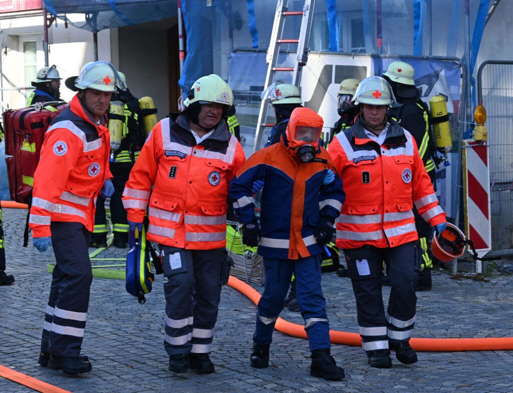 Inzwischen suchen Feuerwehrleute mit Atemschutz das Gebäude ab. Es qualmt noch immer. Eine Person wird herausgebracht. In Obhut des Roten Kreuzes gegeben.