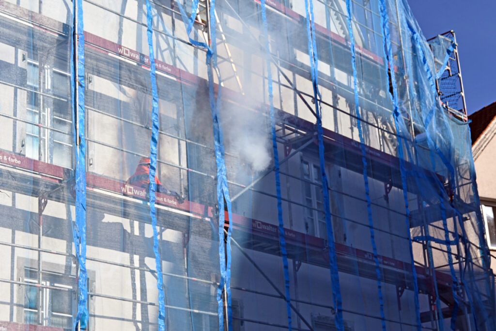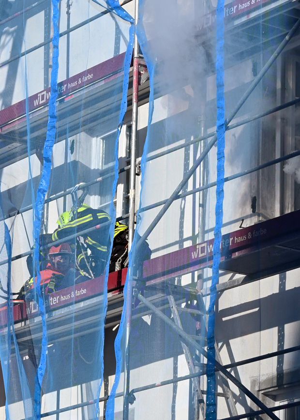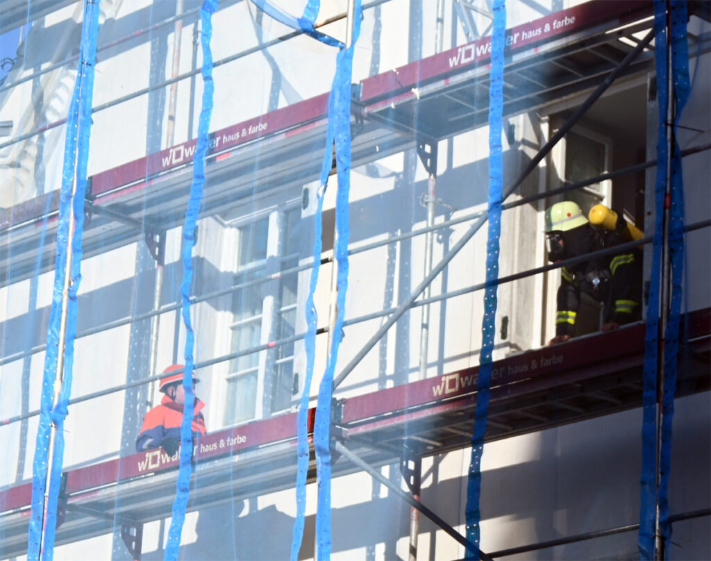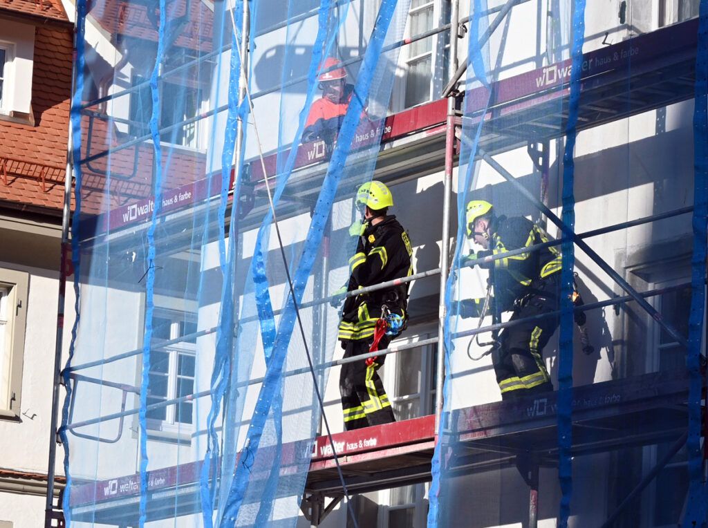 Qualm drang aus einem Fenster des Neuen Rathauses. Ein Verletzter hatte sich auf das Baugerüst gerettet. So sah das Einsatzszenario für die Bad Waldseer Wehr aus.