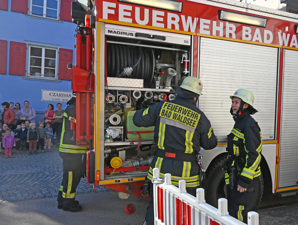 Bad Waldsee – Der Kirbemontag in Bad Waldsee steht traditionell im Zeichen der Floriansjünger, die auch in diesem Jahr wieder mit Können und Gerät vor der Bürgerschaft glänzen konnten. Das Wetter war prächtig und es hatten sich viele Zuschauer, darunter auch Bürgermeisterin Monika Ludy, Alt-Bürgermeister Rudolf Forcher und „Feuerwehrmutter“ Sonja Wild, eingefunden. Natürlich war auch OB Henne vor Ort.