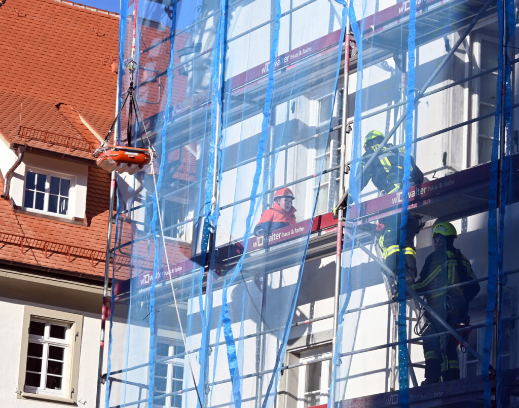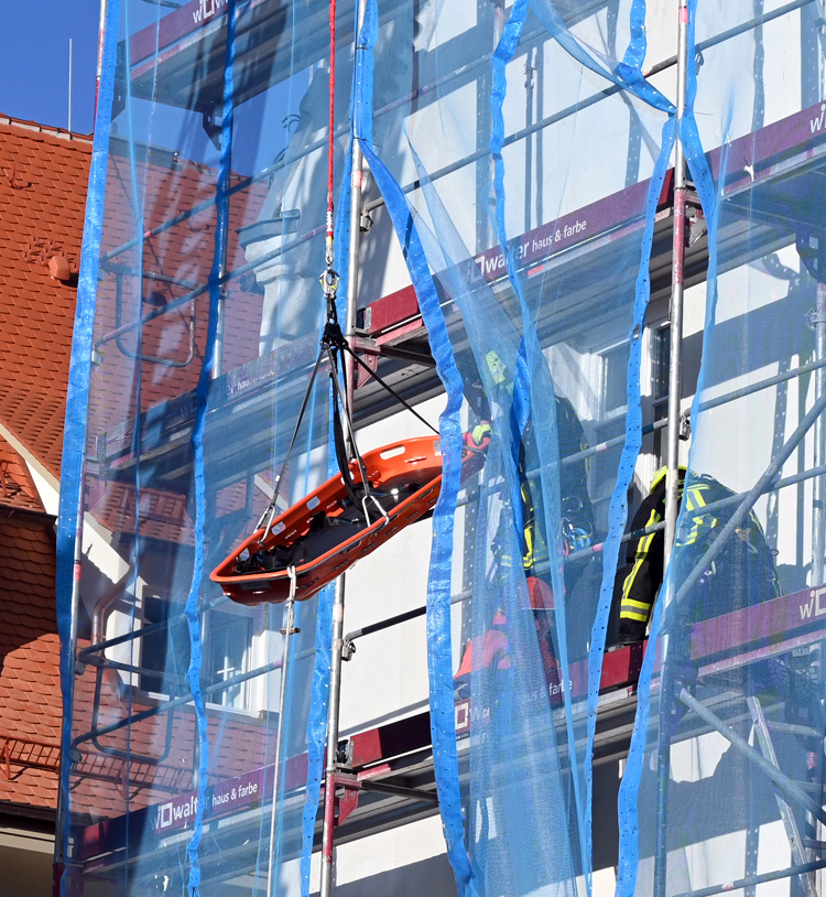 Die Höhenretter mühen sich mit der Trage ab. Mit dem Verletzten kann sie die Drehleiter nicht mehr aus dem Gerüst ausheben. Von Hand kriegen sie die Geländerstangen des Gerüstes nicht auf. Eine Axt muss her. Die wird mit einem Seil nach oben gezogen. Ein paar Hiebe mit der Axt. Die Geländerstange löst sich. Die Wehrmänner sind sicher an ihren Haltegurten eingehängt. „Sicherheit steht an erster Stelle“, meint Kreisbrandmeister Surbeck und verfolgt die Szene mit Kennerblick. „Gut machen die das“, lobt er.