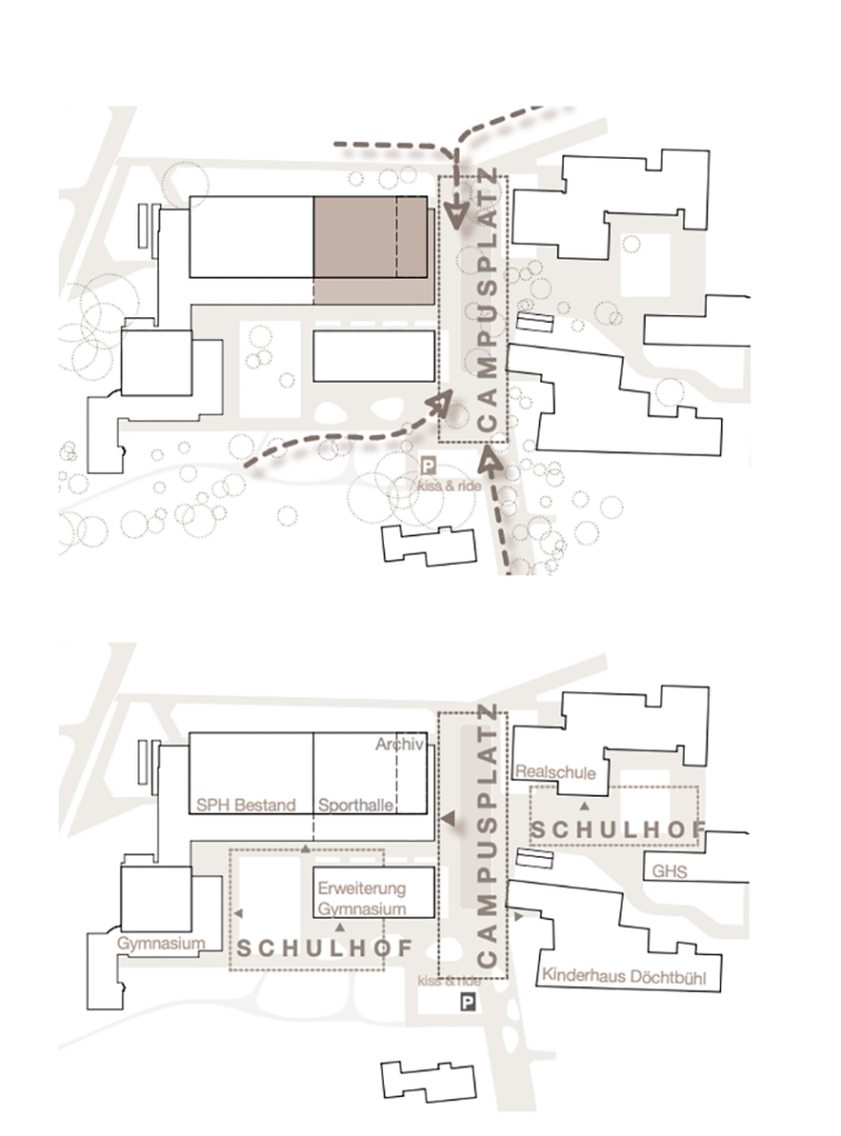 Das Schulzentrum auf dem Döchtbühl. Im Plan oben ist der Sporthallenanbau dunkel markiert. Plan: LandSchwager (entnommen den Sitzungsvorlagen)