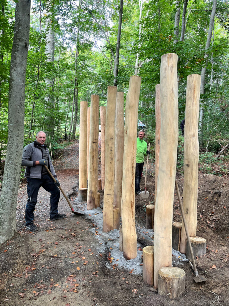 Stangenwald: Frank Schlimpert und Reinhold Ringer vom Baubetriebshof bei Arbeiten am Sportpfad. Foto: Martin Nuber