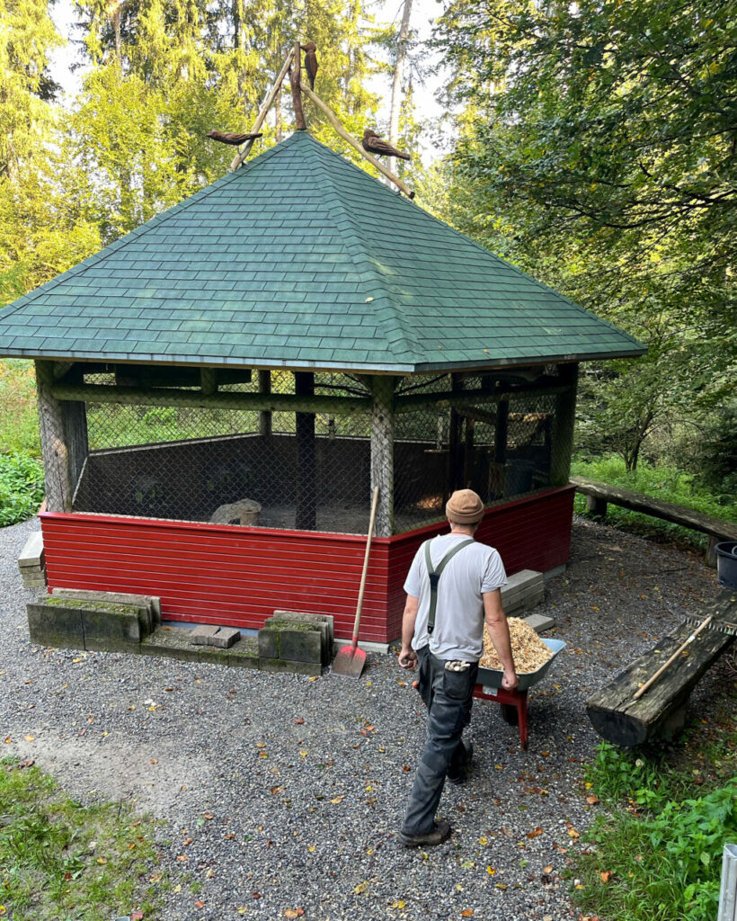Die Sanierung des Waldvogelhauses ist abgeschlossen, wenn auch mit Verzögerungen, da während der Arbeiten mehr defekte Hölzer entdeckt wurden als ursprünglich angenommen. Die gesamte Fassade wurde mit einer sogenannten Rhombus-Schalung verkleidet und das Dach komplett neu aufgebaut und eingedeckt. Zum Schutz gegen Mäuse kamen Drahtgewebe und viel Beton zum Einsatz. Nach einem frischen Anstrich erstrahlt das Vogelhaus nun in Schwedenrot mit grünem Dach und bietet den Zwerghühnern eine neue Heimat.
