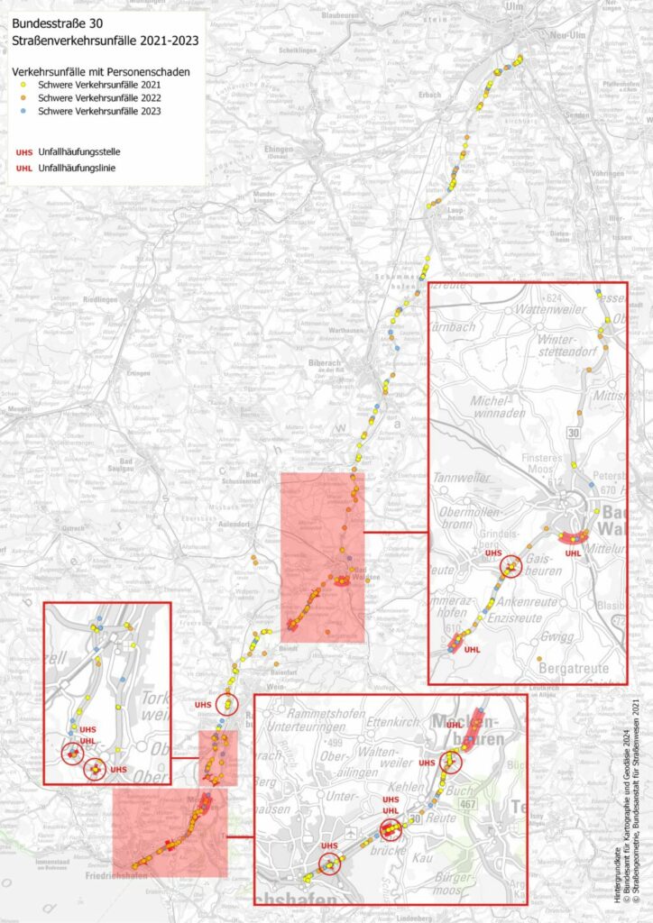Das „Merkblatt zur örtlichen Unfalluntersuchung in Unfallkommissionen (M UKO)“ gibt Hinweise zur Erkennung und Analyse von Unfallhäufungsstellen sowie zu möglichen Verbesserungsmaßnahmen. Bei strikter Auslegung gibt es nach der Dreijahreskarte 2021–2023 auf der B30 insgesamt 14 Unfallschwerpunkte: Unfallhäufungsstellen in Friedrichshafen (1), Lochbrücke (3), Meckenbeuren (1), bei Untereschach (2), Ravensburg (1) und in Gaisbeuren (1). Hinzu kommen sogenannte Unfallhäufungslinie bei Lochbrücke (1), Meckenbeuren (1), Untereschach (1), Enzisreute (1) und Bad Waldsee (1). Alle Unfallschwerpunkte der B 30 liegen im Landkreis Ravensburg und dem Bodenseekreis, in den Gemeinden Bad Waldsee (3), Ravensburg (4), Meckenbeuren (6) und Friedrichshafen (1).